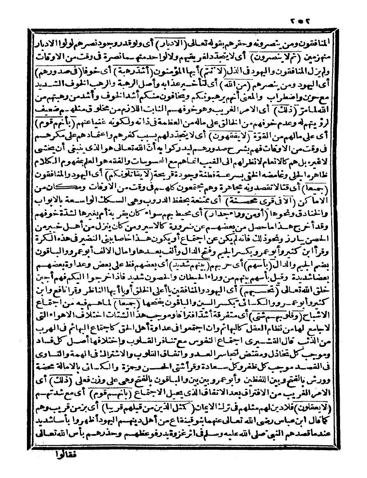 {لأنتم} أيها المؤمنون {أشد رهبة} أي: خوفاً {في صدورهم} أي: اليهود ومن ينصرهم {من الله} أي: لتأخير عذابه، وأصل الرهبة والرهب: الخوف الشديد مع حزن واضطراب، والمعنى: أنهم يرهبونكم ويخافون منكم أشد الخوف، وأشد من رهبتهم من الله لما مرّ. {ذلك} أي: الأمر الغريب وهو خوفهم الثابت اللازم من مخلوق مثلهم ضعيف لرؤيتهم له، وعدم خوفهم من الخالق على ماله من العظمة في ذاته، ولكونه غنياً عنهم {بأنهم قوم} أي: على ما لهم من القوة {لا يفقهون} أي: لا يتجدّد لهم بسبب كفرهم واعتمادهم على مكرهم في وقت من الأوقات، فهم يشرح صدورهم ليدركوا به أنّ الله تعالى هو الذي ينبغي أن يخشى لا غيره، بل هم كالأنعام لا نظر لهم إلى الغيب إنما هم مع المحسوسات. والفقه هو العلم بمفهوم الكلام ظاهره الجلي وغامضه الخفي بسرعة فطنة وجودة قريحة.