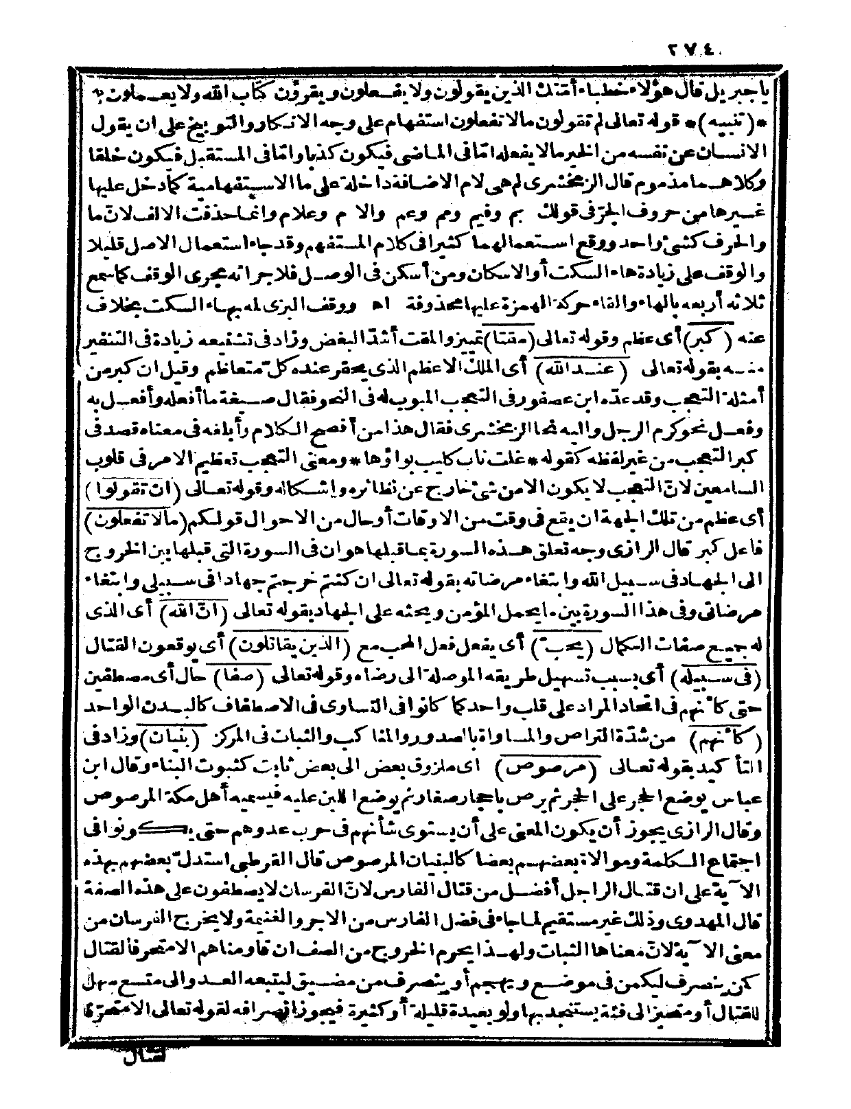 وقال ابن عباس: يوضع الحجر على الحجر، ثم يرص بأحجار صغار، ثم يوضع اللبن عليه فيسميه أهل مكة المرصوص. وقال الرازي: يجوز أن يكون المعنى على أن يستوي شأنهم في حرب عدوهم، حتى يكونوا في اجتماع الكلمة وموالاة بعضهم بعضاً كالبنيان المرصوص قال القرطبي: استدل بعضهم بهذه الآية على أن قتال الراجل أفضل من قتال الفارس، لأن الفرسان لا يصطفون على هذه الصفة. قال المهدوي: وذلك غير مستقيم لما جاء في فضل الفارس من الأجر والغنيمة، ولا يخرج الفرسان من معنى الآية لأن معناها الثبات، ولهذا يحرم الخروج من الصف إن قاومناهم إلا متحرفاً لقتال، كمن ينصرف ليكمن في موضع ويهجم، أو ينصرف من مضيق ليتبعه العدو إلى متسع سهل للقتال، أو متحيز إلى فئة يستنجد بها ولو بعيدة قليلة أو كثيرة، فيجوز انصرافه لقوله تعالى: {إلا