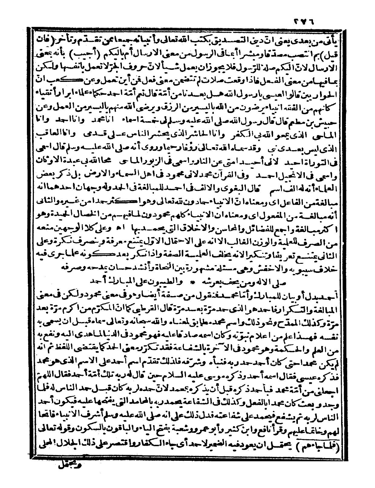 والثاني: أنه مبالغة من المفعول، أي: ومعناه أن الأنبياء كلهم محمودون لما فيهم من الخصال الحميدة، وهو أكثر مبالغة وأجمع للفضائل والمحاسن والأخلاق التي يحمد بها ا. هـ. وعلى كلا الوجهين منعه من الصرف للعملية والوزن الغالب، إلا أنه على الاحتمال الأول يمتنع معرفة وينصرف نكرة، وعلى الثاني يمتنع تعريفاً وتنكيراً لأنه يخلف العلمية الصفة، وإذا نكر بعد كونه علماً جرى فيه خلاف سيبويه والأخفش، وهي مسألة مشهورة بين النحاة. وأنشد حسان يمدحه وصرفه: