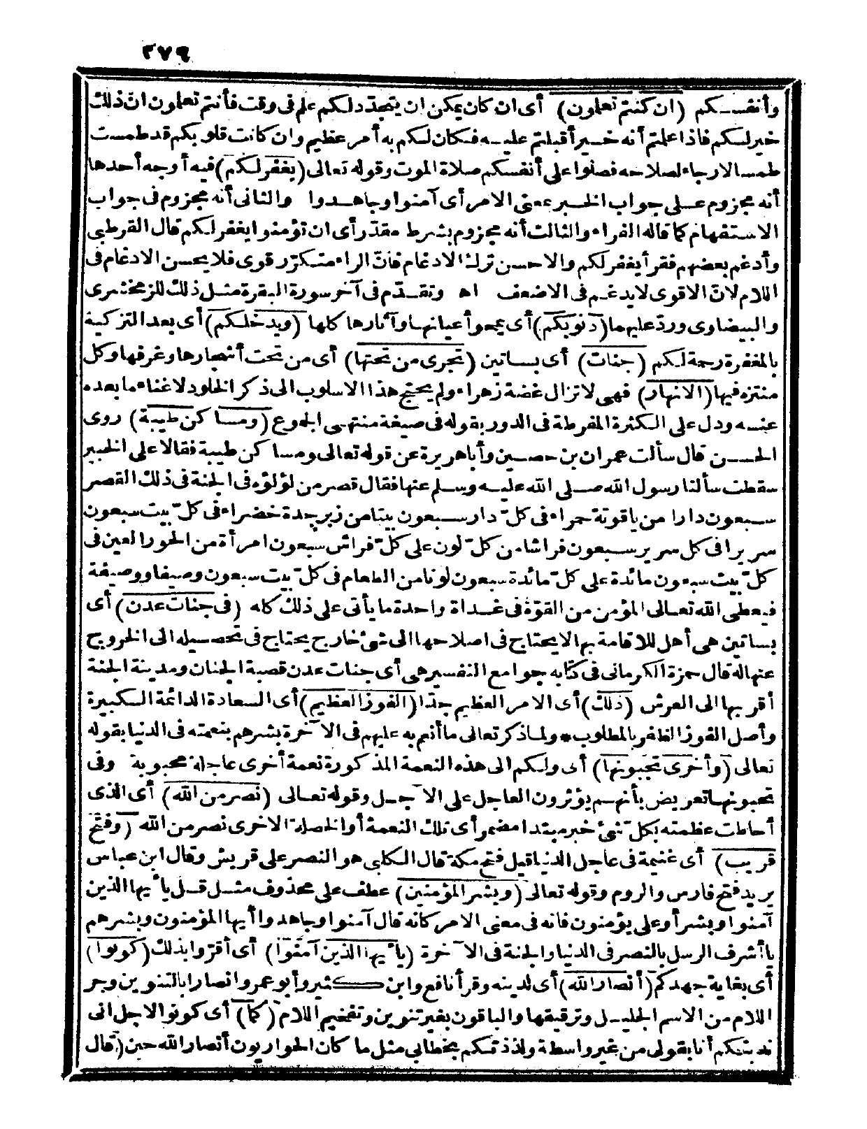 والثالث: أنه مجزوم بشرط مقدر، أي: إن تؤمنوا يغفر لكم. قال القرطبي: وأدغم بعضهم فقرأ يغفر لكم، والأحسن ترك الإدغام فإن الراء متكرر قوي فلا يحسن الإدغام في اللام، لأن الأقوى لا يدغم في الأضعف ا. هـ. وتقدم في آخر سورة البقرة مثل ذلك للزمخشري والبيضاوي ورد عليهما {ذنوبكم} أي: يمحو أعيانها وآثارها كلها {ويدخلكم} أي: بعد التزكية بالمغفرة رحمة لكم {جنات} أي: بساتين {تجري من تحتها} أي: من تحت أشجارها وغرفها وكل منتزه فيها {الأنهار} فهي لا تزال غضة زهراء لم يحتج هذا الأسلوب إلى ذكر الخلود لإغناء ما بعده عنه، ودل على الكثرة المفرطة في الدور بقوله في صيغة منتهى الجموع {ومساكن طيبة} روى الحسن قال: «سألت عمران بن حصين، وأبا هريرة عن قوله تعالى: {ومساكن طيبة} فقالا: على الخبير سقطت سألنا رسول الله صلى الله عليه وسلم عنها فقال: «قصر من لؤلؤة في الجنة في ذلك القصر سبعون داراً من ياقوتة حمراء، في كل دار سبعون بيتاً من زبرجدة خضراء، في كل بيت سبعون سريراً، في كل سرير سبعون فراشاً من كل لون على كل فراش سبعون امرأة من الحور العين، في كل بيت سبعون مائدة على كل مائدة سبعون لوناً من الطعام، في كل بيت سبعون وصيفاً ووصيفة فيعطي الله تعالى المؤمن من القوة في غداة واحدة ما يأتي على ذلك كله» {في جنات عدن} أي: بساتين هي أهل للإقامة بها لا يحتاج في إصلاحها إلى شيء خارج يحتاج في تحصيله إلى الخروج عنها له، قال حمزة الكرماني في كتابه «جوامع التفسير» : هي أي جنات عدن قصبة الجنان ومدينة الجنة أقربها إلى العرش {ذلك} أي: الأمر العظيم جداً {الفوز العظيم} أي: السعادة الدائمة الكبيرة، وأصل الفوز الظفر بالمطلوب.