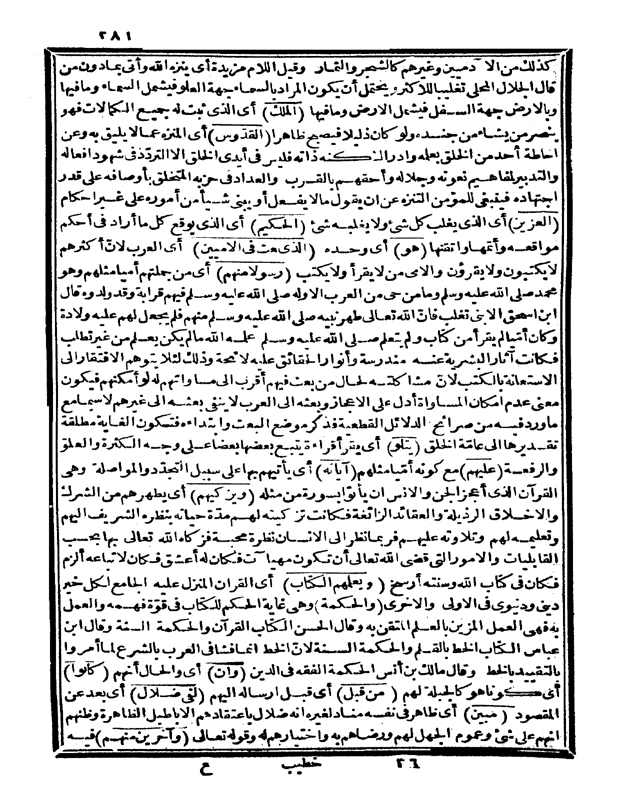 كذلك من الآدميين وغيرهم كالشجر والثمار، وقيل: اللام مزيدة، أي: ينزه الله وأتى بما دون من، قال الجلال المحلي: تغليباً للأكثر، ويحتمل أن يكون المراد بالسماء جهة العلو فيشمل السماء وما فيها، وبالأرض جهة السفل فيشمل الأرض وما فيها {الملك} أي: الذي ثبت له جميع الكمالات، فهو ينصر من يشاء من جنده ولو كان ذليلاً فيصبح ظاهراً {القدوس} أي: المنزه عما لا يليق به، وعن إحاطة أحد من الخلق بعلمه وإدراك كنه ذاته فليس في أيدي الخلق إلا التردد في شهود أفعاله والتدبير لمفاهيم نعوته وجلاله وأحقهم بالقرب والعداد في حزبه المتخلق بأوصافه على قدر اجتهاده، فينبغي للمؤمن التنزه عن أن يقول مالا يفعل، أو يبني شيئاً من أموره على غير إحكام {العزيز} أي: الذي يغلب كل شيء ولا يغلبه شيء {الحكيم} أي: الذي يوقع كل ما أراد في أحكم مواقعه وأتمها وأتقنها.
