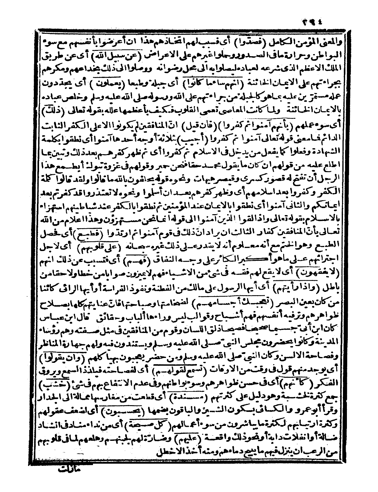 الثالث: أن يراد أنّ ذلك في قوم آمنوا ثم ارتدّوا {فطبع} أي: فحصل الطبع وهو الختم مع أنه معلوم أنه لا يقدر على ذلك غيره سبحانه {على قلوبهم} أي: لأجل اجترائهم على ما هو أكبر الكبائر على وجه النفاق {فهم} أي: فتسبب عن ذلك أنهم {لا يفقهون} أي: لا يقع لهم فقه في شيء من الأشياء، فهم لا يميزون صواباً من خطأ، ولا حقاً من باطل.
