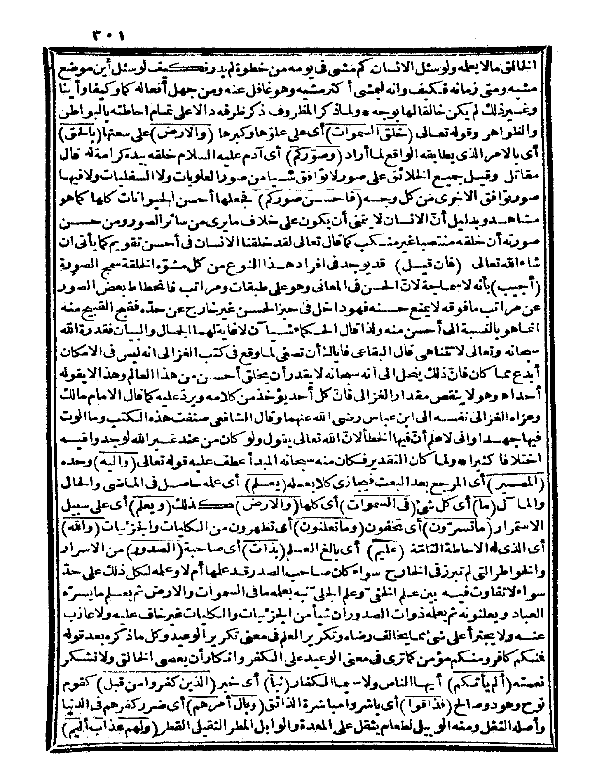 قال البقاعي: فإياك أن تصغي لما وقع في كتب الغزالي إنه ليس في الإمكان أبدع مما كان، فإن ذلك ينحل إلى أنه سبحانه لا يقدر أن يخلق أحسن من هذا العالم، وهذا لا يقوله أحد، ا. هـ. وهو لا ينقص مقدار الغزالي فإن كل أحد يؤخذ من كلامه ويرد عليه كما قال الإمام مالك، وعزاه الغزالي نفسه إلى ابن عباس رضي الله عنهما، وقال الشافعي: صنفت هذه الكتب وما ألوت فيها جهداً وإني لا علم أن فيها الخطأ لأن الله تعالى يقول: {ولو كان من عند غير الله لوجدوا فيه اختلافاً كثيرا} (النساء: 82)