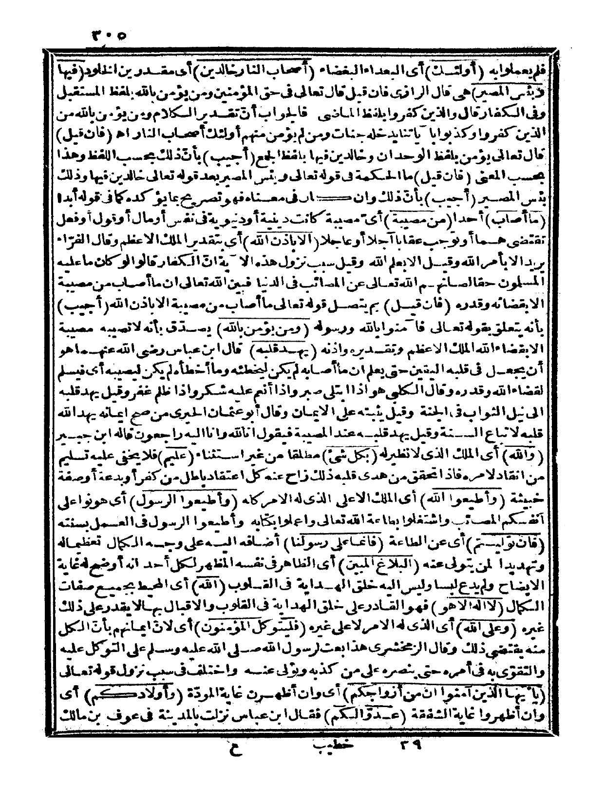 فإن قيل: بم يتصل قوله تعالى: {ما أصاب من مصيبة إلا بإذن الله} ؟ أجيب: بأنه يتعلق بقوله تعالى: {فآمنوا بالله ورسوله} .