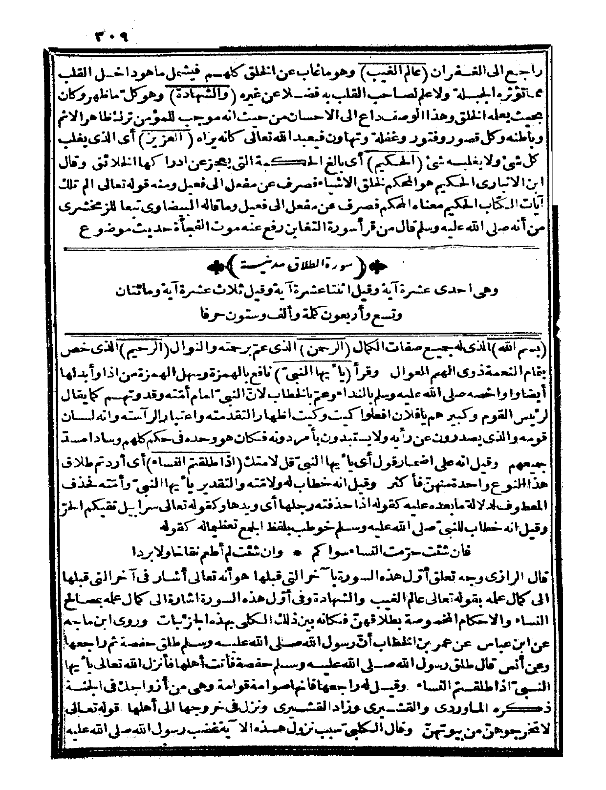 قال الرازي: وجه تعلق أول هذه السورة بآخر التي قبلها، هو أنه تعالى أشار في آخر التي قبلها إلى كمال علمه بقوله تعالى: {عالم الغيب والشهادة} وفي أول هذه السورة إشارة إلى كمال علمه بمصالح النساء والأحكام المخصوصة بطلاقهن، فكأنه بين ذلك الكلي بهذه الجزئيات.