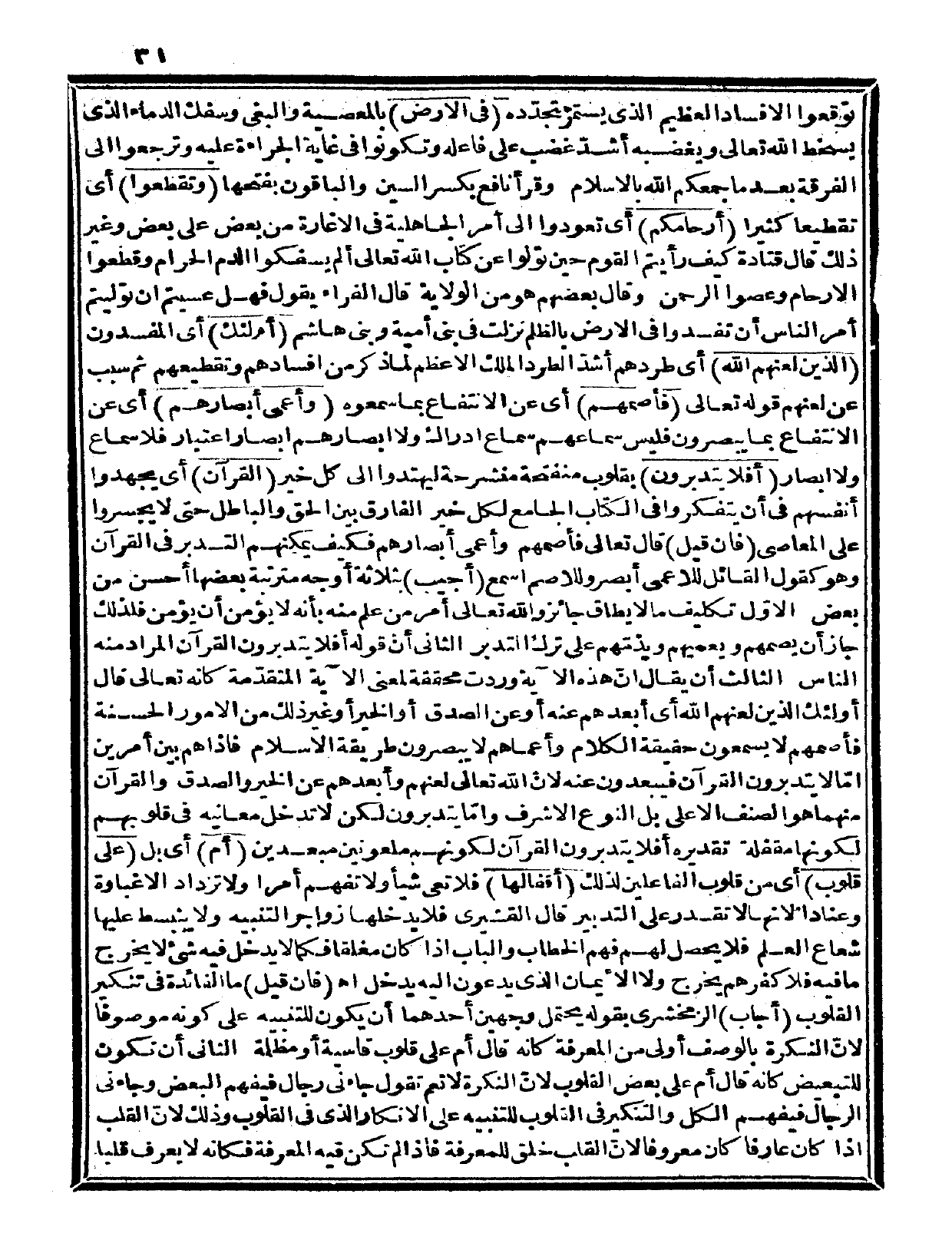الثاني: أن تكون للتبعيض كأنه قال أم على بعض القلوب لأنّ النكرة لا تعم تقول: جاءني رجال فيفهم البعض، وجاءني الرجال فيفهم الكل. والتنكير في القلوب للتنبيه على الإنكار الذي في القلوب، وذلك لأنّ القلب إذا كان عارفاً كان معروفاً، لأنّ القلب خلق للمعرفة فإذا لم تكن فيه المعرفة، فكأنه لا يعرف قلباً