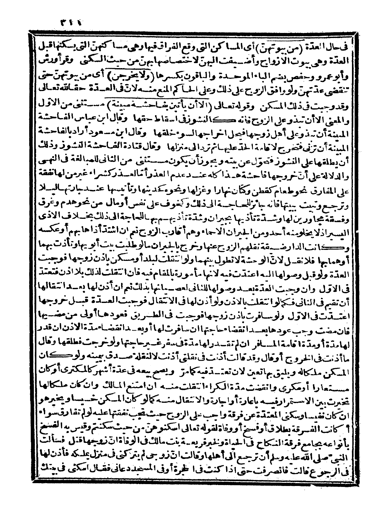 وقال ابن عباس: الفاحشة المبينة أن تبدو على أهل زوجها فيحل إخراجها لسوء خلقها وقال ابن مسعود: أراد بالفاحشة المبينة أن تزني فتخرج لإقامة الحد عليها، ثم ترد إلى منزلها. وقال قتادة: الفاحشة النشوز، وذلك أن يطلقها على النشوز فتحوّل عن بيته. ويجوز أن يكون مستثنى من الثاني للمبالغة في النهي والدلالة على أن خروجها فاحشة هذا كله عند عدم العذر، أما لعذر كشراء غير من لها نفقة على المفارق نحو طعام كقطن وكتان نهاراً، وغزلها ونحوه كحديثها وتأنيسها عند جارتها ليلاً وترجع وتبيت ببيتها، فإنه جائز للحاجة إلى ذلك، وكخوف على نفس أو مال من نحو هدم وغرق وفسقة مجاورين لها وشدة تأذيها بجيران وشدة تأذيهم بها للحاجة إلى ذلك، بخلاف الأذى اليسير إذ لا يخلو منه أحد ومن الجيران الإحماء وهم أقارب الزوج، نعم إن اشتد أذاها بهم أو عكسه وكانت الدار ضيقة نقلهم الزوج عنها وخرج بالجيران ما لو طلبت بيت أبويها وتأذت بهما أو هما بها فلا نقل، لأن الوحشة لا تطول بينهما، ولو انتقلت لبلد أو مسكن بإذن زوجها فوجبت العدة، ولو قبل وصولها إليه اعتدت فيه لأنها مأمورة بالمقام فيه، فإن انتقلت لذلك بلا إذن فتعتد في الأول وإن وجبت العدة بعد وصولها للثاني لعصيانها بذلك. نعم إن أذن لها بعد انتقالها أن تقيم في الثاني فكما لو انتقلت بالإذن.