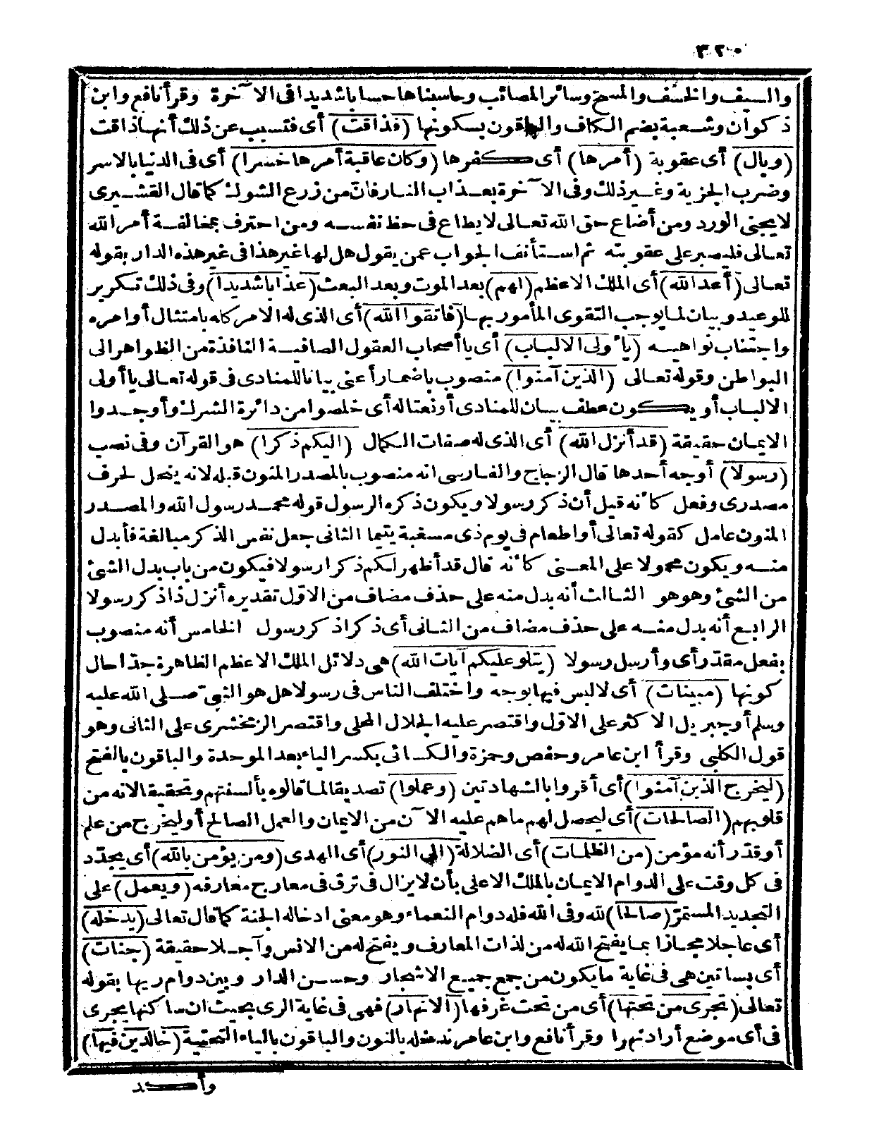 الخامس: أنه منصوب بفعل مقدر، أي: وأرسل رسولاً {يتلو عليكم آيات الله} هي دلائل الملك الأعظم الظاهرة جداً حال كونها {مبينات} أي: لا لبس فيها بوجه. واختلف الناس في رسولاً هل هو النبي صلى الله عليه وسلم أو جبريل؟ الأكثر على الأول واقتصر عليه الجلال المحلي، واقتصر الزمخشري على الثاني، وهو قول الكلبي. وقرأ ابن عامر وحفص وحمزة والكسائي بكسر الياء بعد الموحدة، والباقون بالفتح {ليخرج الذين أمنوا} أي: أقروا بالشهادتين {وعملوا} تصديقاً لما قالوه بألسنتهم وتحقيقاً لأنه من قلوبهم {الصالحات} أي: ليحصل لهم ما هم عليه الآن من الإيمان والعمل الصالح، أو ليخرج من علم أو قدر أنه مؤمن {من الظلمات} أي: الضلالة {إلى النور} أي: الهدى.