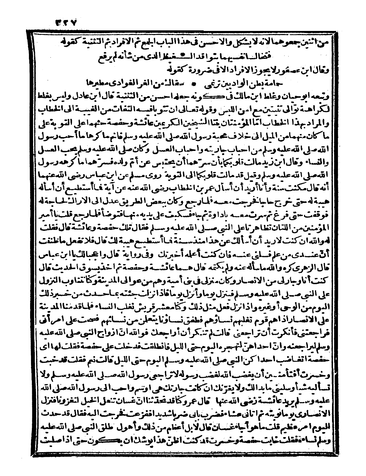 قال الزهري: كره والله ما سأله عنه ولم يكتمه، قال: هما عائشة وحفصة، ثم أخذ يسوق الحديث، قال: كنت أنا وجار لي من الأنصار وكان منزلي في بني أمية وهم من عوالي المدينة، وكنا نتناوب النزول على النبي صلى الله عليه وسلم فينزل يوماً وأنزل يوماً، فإذا نزلت جئته بما حدث من خبر ذلك اليوم من الوحي أو غيره، وإذا نزل فعل مثل ذلك. وكنا معشر قريش نغلب النساء فلما قدمنا المدينة على الأنصار إذا هم قوم تغلبهم نساؤهم فطفق نساؤنا يتعلمن من نسائهم فصحت على امرأتي فراجعتني، فأنكرت أن تراجعني قالت: لم تنكر أن أراجعك؟ فوالله إن أزواج النبي صلى الله عليه وسلم ليراجعنه، وإن إحداهن لتهجره اليوم حتى الليل فانطلقت فدخلت على حفصة فقلت لها: أي حفصة أتغاضب إحداكن النبي صلى الله عليه وسلم اليوم حتى الليل، قالت: نعم، فقلت: قد خبت وخسرت أفتأمنين أن يغضب الله لغضب رسوله لا تراجعي رسول الله صلى الله عليه وسلم ولا تسأليه شيئاً، وسليني ما بدا لك، ولا يغرنك إن كانت جارتك هي أوسم وأحب إلى رسول الله صلى الله عليه وسلم يريد عائشة رضي الله عنها قال عمر: كنا قد تحدثنا أن غسان تنعل الخيل لتغزونا فنزل الأنصاري يوماً نوبته ثم أتاني عشاء فضرب بابي ضرباً شديداً، ففزعت فخرجت إليه فقال: قد حدث اليوم أمر عظيم، قلت: ما هو أجاء غسان؟ قال: لا بل أعظم من ذلك وأهول، طلق النبي صلى الله عليه وسلم نساءه، فقلت: خابت حفصة وخسرت قد كنت أظن هذا يوشك أن يكون حتى إذا صليت