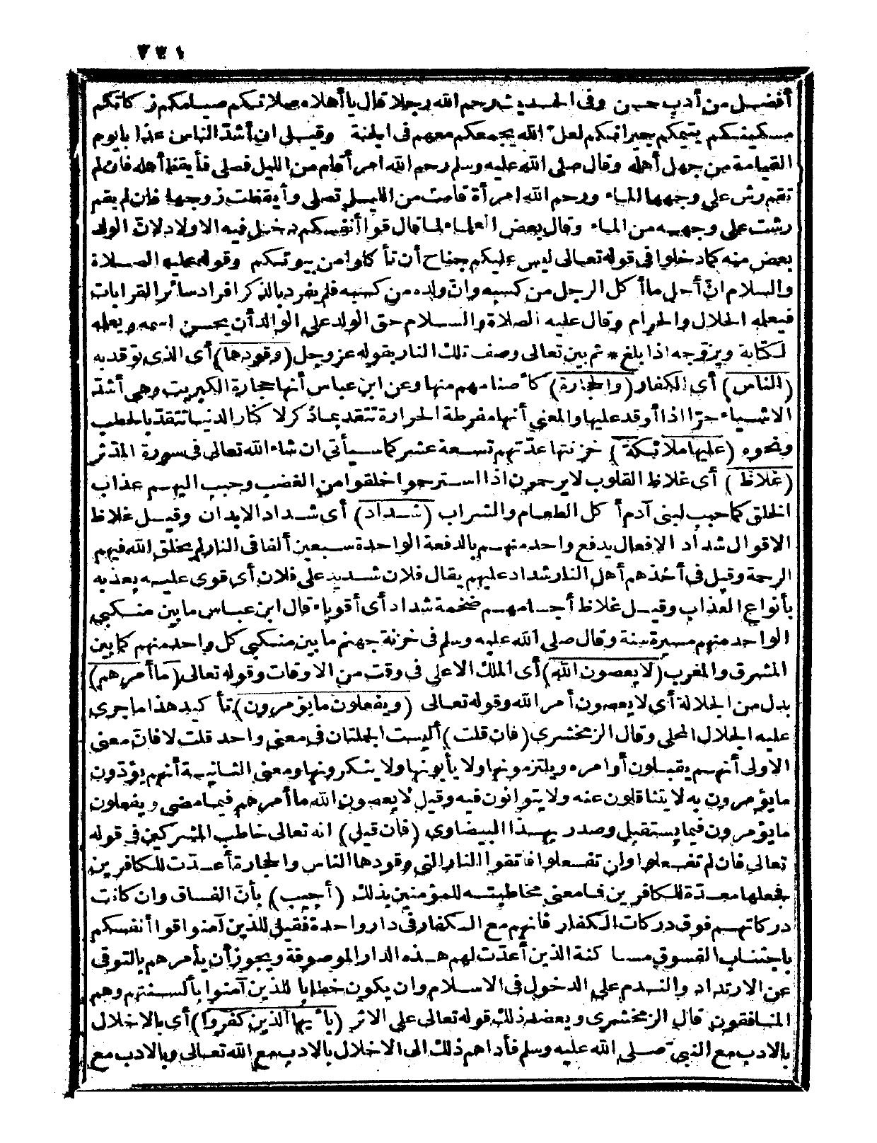 أفضل من أدب حسن» وفي الحديث: «رحم الله رجلاً قال: يا أهلاه صلاتكم صيامكم زكاتكم مسكينكم يتيمكم جيرانكم لعل الله يجمعكم معهم في الجنة» وقيل: إن أشد الناس عذاباً يوم القيامة من جهل أهله، وقال صلى الله عليه وسلم «رحم الله امرأ قام من الليل فصلى فأيقظ أهله، فإن لم تقم رش على وجهها الماء، ورحم الله امرأة قامت من الليل تصلي وأيقظت زوجها، فإن لم يقم رشت على وجهه من الماء» وقال بعض العلماء: لما قال {قوا أنفسكم} دخل فيه الأولاد لأن الولد بعض منه، كما دخلوا في قوله تعالى: {ولا عل أنفسكم جناح أن تأكلوا من بيوتكم} (النور: 61) وقوله عليه الصلاة والسلام: «إن أحل ما أكل الرجل من كسبه وان ولده من كسبه» فلم يفرد بالذكر أفراد سائر القرابات فيعلمه الحلال والحرام. وقال عليه الصلاة والسلام: «حق الولد على الوالد أن يحسن اسمه، ويعلمه الكتابة، ويزوجه اذا بلغ» .