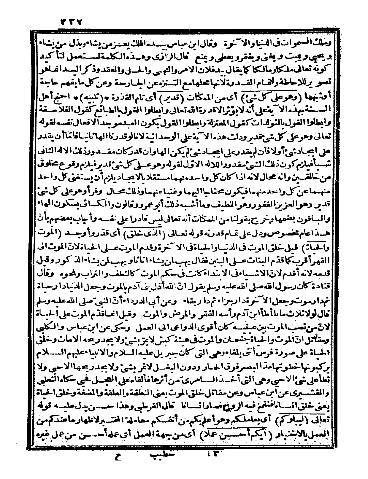 وقيل: قدمه لأنه أقدم، لأنّ الأشياء في الابتداء كانت في حكم الموت كالنطف والتراب ونحوه. وقال قتادة: كان رسول الله صلى الله عليه وسلم يقول: «إن الله أذل بني آدم بالموت وجعل الدنيا دار حياة ثم دار موت وجعل الآخرة دار جزاء ثم دار بقاء» وعن أبي الدرداء أن النبي صلى الله عليه وسلم قال: «لولا ثلاث ما طأطأ ابن آدم رأسه الفقر والمرض والموت» وقيل: إنما قدم الموت على الحياة لأن من نصب الموت بين عينيه كان أقوى الدواعي إلى العمل، وحكي عن ابن عباس والكلبي ومقاتل أنّ الموت والحياة جسمان، والموت في هيئة كبش لا يمر بشيء ولا يجد ريحه إلا مات، وخلق الحياة على صورة فرس أنثى بلقاء وهي التي كان جبريل عليه السلام والأنبياء عليهم السلام يركبونها خطوتها مدّ البصر فوق الحمار ودون البغل لا تمر بشيء ولا يجد ريحها إلا حيي ولا تطأ على شيء إلا حيي وهي التي أخذ السامري من أثرها فألقاه على العجل فحيي، حكاه الثعلبي والقشيري عن ابن عباس.