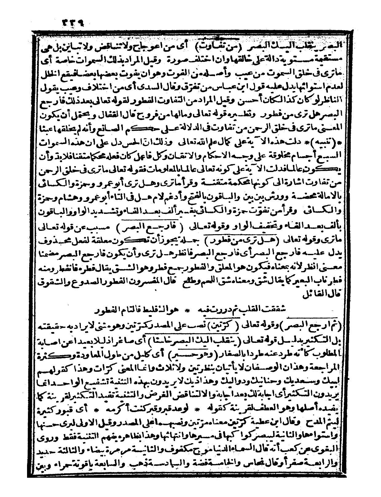البصر} {ينقلب إليك البصر} {من تفاوت} ، أي: من اعوجاج ولا تناقض ولا تباين بل هي مستقيمة مستوية دالة على خالقها وإن اختلف صورة، وقيل: المراد بذلك السموات خاصة، أي: ما ترى في خلق السموات من عيب وأصله من الفوت وهو: أن يفوت بعضها بعضاً فيقع الخلل لعدم استوائها يدل عليه قول ابن عباس: من تفرّق، وقال السدي: أي من اختلاف وعيب يقول الناظر: لو كان كذا لكان أحسن، وقيل: المراد من التفاوت الفطور لقوله تعالى بعد ذلك: {فارجع البصر هل ترى من فطور} ونظيره قوله تعالى: {وما لها من فروج} (ق: 6) قال القفال: ويحتمل أن يكون المعنى: ما ترى في خلق الرحمن من تفاوت في الدلالة على حكم الصانع وأنه لم يخلقها عبثاً.