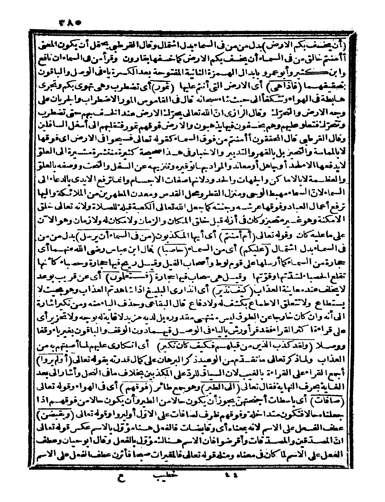 وقال القرطبي: قال المحققون: أأمنتم من فوق السماء كقوله تعالى: {فسيحوا في الأرض} (التوبة: 2) ، أي: فوقها لا بالمماسة والتحيز بل بالقهر والتدبير والأخبار في هذا صحيحة كثيرة منتشرة مشيرة إلى العلوّ لا يدفعها إلا ملحد أو جاهل أو معاند، والمراد بها توقيره وتنزيهه عن السفل والتحت ووصفه بالعلوّ والعظمة لا بالأماكن والجهات والحدود، لأنها صفات الأجسام وإنما ترفع الأيدي بالدعاء إلى السماء، لأن السماء مهبط الوحي ومنزل القطر ومحل القدس ومعدن المطهرين من الملائكة وإليها ترفع أعمال العباد وفوقها عرشه وجنته، كما جعل الله تعالى الكعبة قبلة للصلاة، ولأنه تعالى خلق الأمكنة وهو غير متحيز وكان في أزله قبل خلق المكان والزمان ولا مكان له ولا زمان وهو الآن على ما عليه كان.