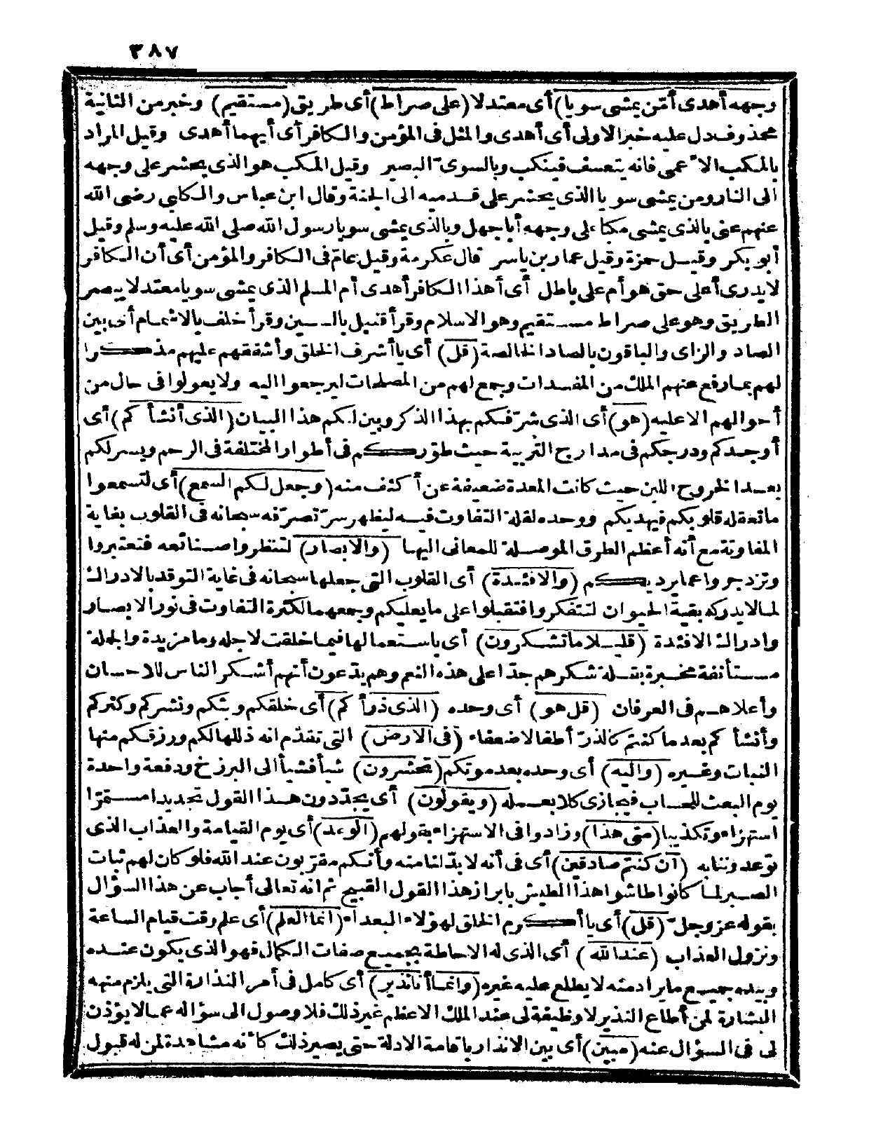وجهه أهدى أمن يمشي سوياً} أي: معتدلاً {على صراط} أي: طريق {مستقيم} وخبر من الثانية محذوف دل عليه خبر الأولى، أي: أهدى، والمثل في المؤمن والكافر، أي: أيهما أهدى، وقيل: المراد بالمكب الأعمى، فإنه يتعسف فينكب وبالسوي البصير. وقيل: المكب هو الذي يحشر على وجهه إلى النار، ومن يمشي سوياً: الذي يحشر على قدميه إلى الجنة، وقال ابن عباس والكلبي رضي الله عنهم: عنى بالذي يمشي مكباً على وجهه أبا جهل، وبالذي يمشي سوياً رسول الله صلى الله عليه وسلم وقيل: أبو بكر، وقيل: حمزة، وقيل: عمار بن ياسر، قال عكرمة: وقيل: عامٌّ في الكافر والمؤمن، أي: أن الكافر لا يدري أعلى حق هو أم على باطل، أي: أهذا الكافر أهدى أم المسلم الذي يمشي سوياً معتدلاً يبصر الطريق وهو على صراط مستقيم وهو الإسلام، وقرأ قنبل بالسين وقرأ خلف بالإشمام، أي: بين الصاد والزاي والباقون بالصاد الخالصة.