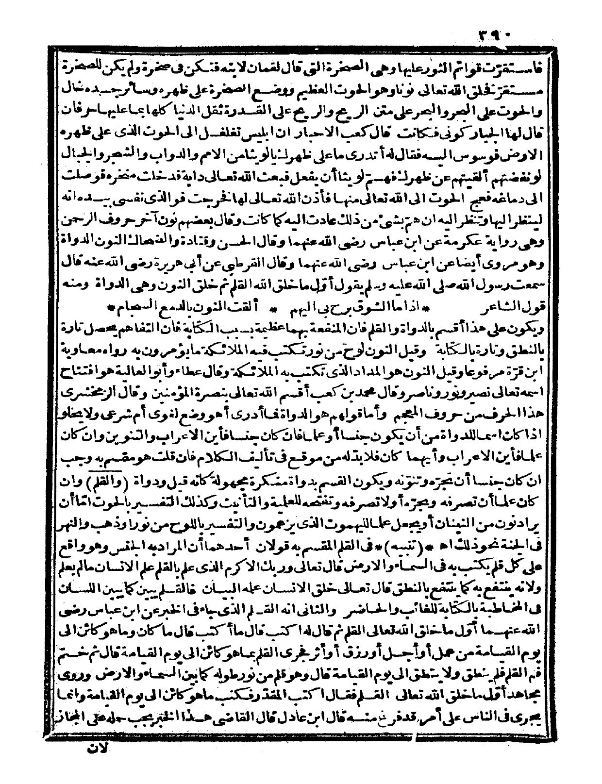 وقال الزمخشري: هذا الحرف من حروف المعجم، وأما قولهم: هو الدواة فما أدري أهو وضع لغوي أم شرعي ولا يخلو إذا كان اسماً للدواة من أن يكون جنساً أو علماً، فإن كان جنساً فأين الإعراب والتنوين، وإن كان علماً فأين الإعراب وأيهما كان فلا بد له من موقع في تأليف الكلام. فإن قلت: هو مقسم به وجب إن كان جنساً أن تجره وتنونه ويكون القسم بدواة منكرة مجهولة كأنه قيل: ودواة {والقلم} وإن كان علماً أن تصرفه وتجره أو لا تصرفه وتفتحه للعملية والتأنيث.