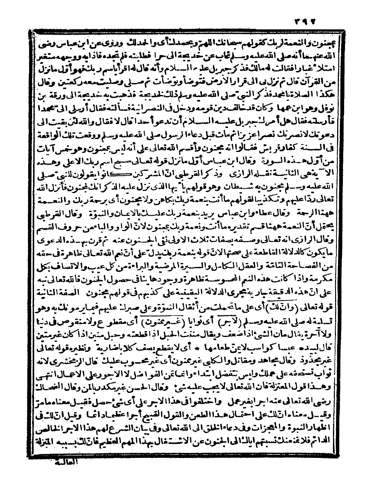 وقال ابن عباس: أول ما نزل قوله تعالى: «سبح اسم ربك الأعلى» (الأعلى: 1) وهذه الآية هي الثانية نقله الرازي، وذكر القرطبي أن المشركين كانوا يقولون للنبيّ صلى الله عليه وسلم مجنون به شيطان وهو قولهم: {يا أيها الذي نزل عليه الذكر إنك لمجنون} (الحجر: 6) فأنزل الله تعالى رداً عليهم وتكذيباً لقولهم: {ما أنت بنعمة ربك بكاهن ولا مجنون} (الطور: 29) ، أي: برحمة ربك والنعمة ههنا الرحمة، وقال عطاء وابن عباس: يريد بنعمة ربك عليك بالإيمان والنبوة، وقال القرطبي: يحتمل أن النعمة ههنا قسم تقديره ما أنت ونعمة ربك بمجنون لأن الواو والباء من حروف القسم.