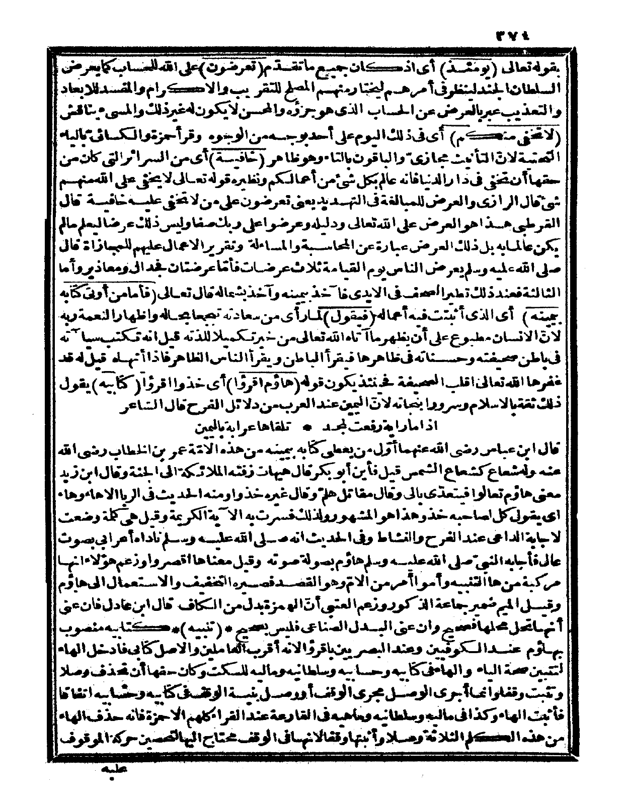 وليس ذلك عرضاً ليعلم ما لم يكن عالماً به، بل ذلك العرض عبارة عن المحاسبة والمساءلة وتقرير الأعمال عليهم للمجازاة قال صلى الله عليه وسلم «يعرض الناس يوم القيامة ثلاث عرضات، فأما عرضتان فجدال ومعاذير، وأما الثالثة فعند ذلك تطير الصحف في الأيدي فآخذ بيمينه وآخذ بشماله» .
