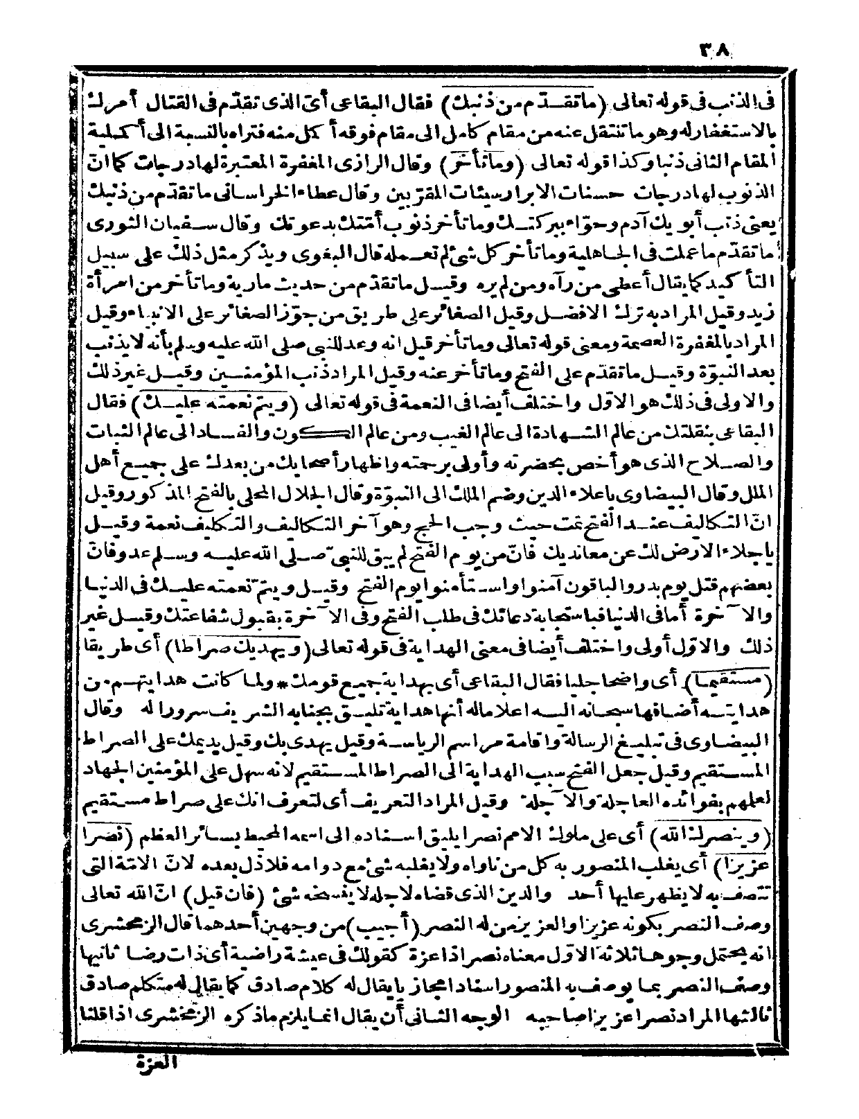 في الذنب في قوله تعالى: {ما تقدّم من ذنبك} فقال البقاعي: أيّ الذي تقدّم في القتال أمرك بالاستغفار له وهو ما تنتقل عنه من مقام كامل إلى مقام فوقه أكمل منه فتراه بالنسبة إلى أكملية المقام الثاني ذنباً. وكذا قوله تعالى: {وما تأخر} وقال الرازي: المغفرة المعتبرة لها درجات كما أن الذنوب لها درجات حسنات الأبرار سيئات المقرّبين، وقال عطاء الخراساني: {ما تقدّم من ذنبك} يعني ذنب أبويك آدم وحوّاء ببركتك وما تأخر ذنوب أمّتك بدعوتك.