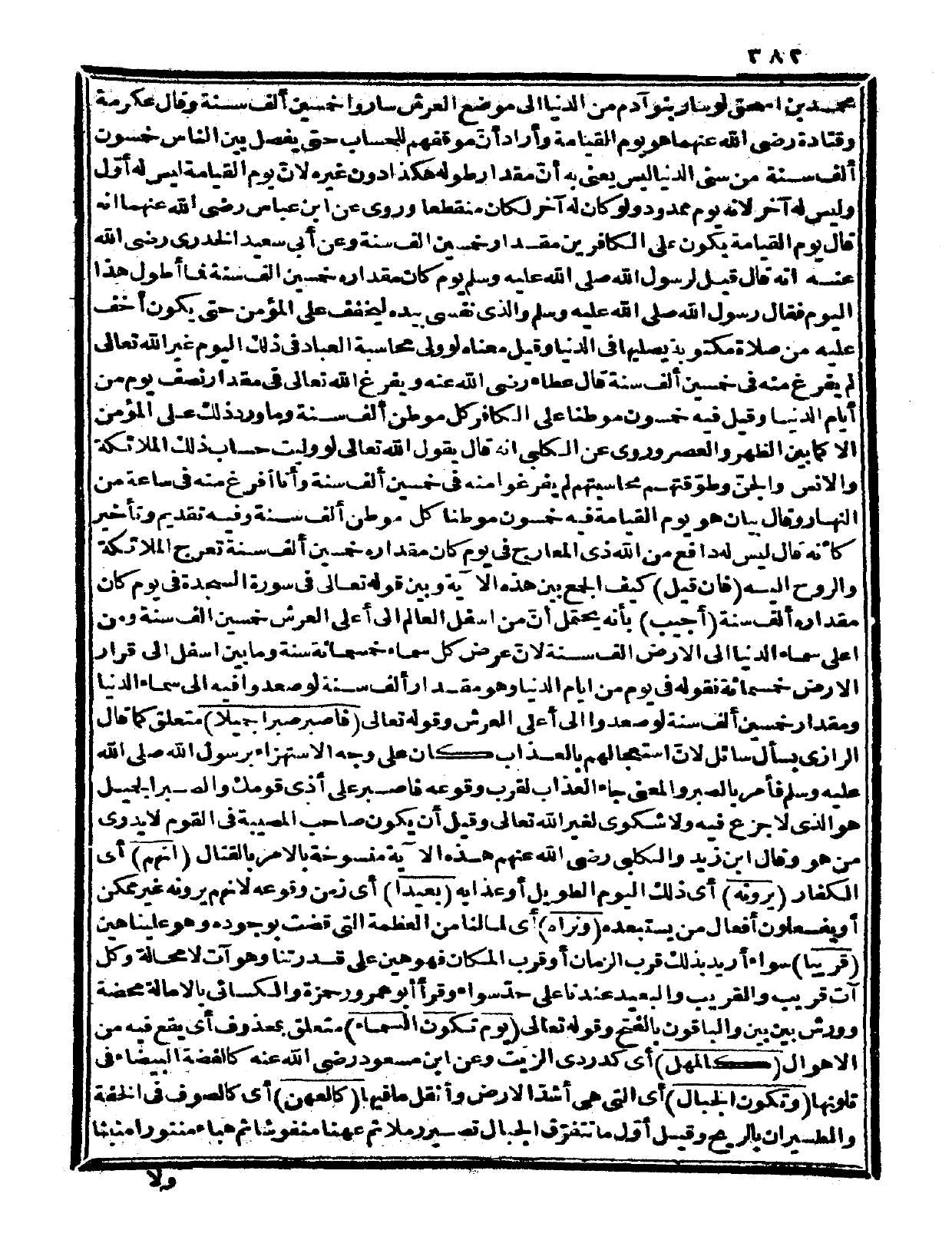 وروي عن ابن عباس رضي الله عنهما أنه قال: يوم القيامة يكون على الكافرين مقدار خمسين ألف سنة، وعن أبي سعيد الخدري رضي الله عنه أنه قال: «قيل: لرسول الله صلى الله عليه وسلم يوم كان مقداره خمسين ألف سنة فما أطول هذا اليوم؟ فقال رسول الله صلى الله عليه وسلم والذي نفسي بيده ليخفف على المؤمن حتى يكون أخف عليه من صلاة مكتوبة يصليها في الدنيا» .