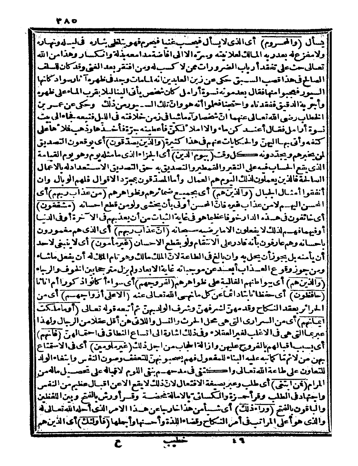 يسأل {والمحروم} أي: الذي لا يسأل، فيحسب غنياً فيحرم فهو يتلظى بناره في ليله ونهاره، ولا مفزع له بعد ربه المالك لعلانيته وسره إلا إلى إفاضة مدامعه بذلة وانكسار، وهذا من الله تعالى حث على تفقد أرباب الضرورات ممن لا كسب له ومن افتقر بعد الغنى، وقد كان للسلف الصالح في هذا قصب السبق، حكي عن زين العابدين أنه لما مات وجد في ظهره آثار سواد كأنها السيور، فعجبوا منها فقال بعد موته نسوة أرامل: كان شخص يأتي إلينا ليلاً بقرب الماء على ظهره وأجربة الدقيق ففقدناه واحتجنا، فعلموا أنه هو وأن تلك السيور من ذلك، وحكي عن عمر بن الخطاب رضي الله تعالى عنهما أن شخصاً رآه ماشياً في زمن خلافته في الليل فتبعه، فجاء إلى بيت نسوة أرامل فقال: أعندكن ماء وإلا املأ لكنّ، فأعطينه جرة فأخذها وذهب فملأها على كتفه وأتى بها إليهنّ. والحكايات عنهم في هذا كثيرة.
