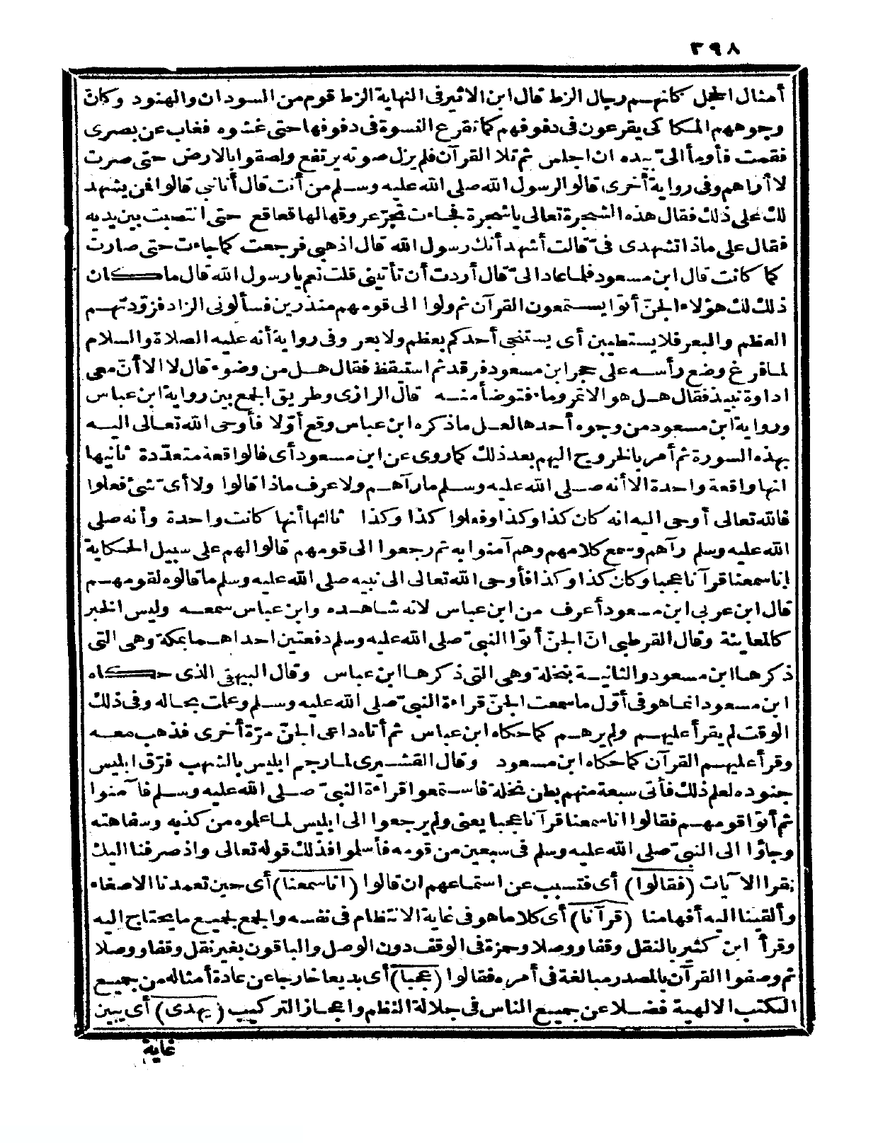 أمثال الحجل كأنهم رجال الزط ـ قال ابن الأثير في النهاية: الزط قوم من السودان والهنود، وكأنّ وجوههم المكاكي، يقرعون في دفوفهم كما تقرع النسوة في دفوفها حتى غشوه ـ فغاب عن بصري فقمت فأومأ إليّ بيده أن اجلس ثم تلا القرآن فلم يزل صوته يرتفع ولصقوا بالأرض حتى صرت لا أراهم» . وفي رواية أخرى «قالوا لرسول الله صلى الله عليه وسلم من أنت؟ قال: أنا نبي. قالوا: فمن يشهد لك على ذلك، فقال: هذه الشجرة تعالي يا شجرة، فجاءت تجرّ عروقها، لها قعاقع حتى انتصبت بين يديه، فقال: على ماذا تشهدين فيّ؟ قالت: أشهد أنك رسول الله، قال: اذهبي، فرجعت كما جاءت حتى صارت كما كانت. قال ابن مسعود: فلما عاد إليّ قال: أردت أن تأتيني قلت: نعم يا رسول الله. قال: ما كان ذلك لك هؤلاء الجنّ أتوا يستمعون القرآن ثم ولوا إلى قومهم منذرين فسألوني الزاد فزوّدتهم العظم والبعر فلا يستطيبن ـ أي يستنجي ـ أحدكم بعظم ولا بعر» وفي رواية: «أنه عليه الصلاة والسلام لما فرغ وضع رأسه على حجر ابن مسعود فرقد ثم استيقظ، فقال: هل من وضوء؟ قال: لا إلا أنّ معي إداوة نبيذ فقال: هل هو إلا تمر وماء فتوضأ منه» .