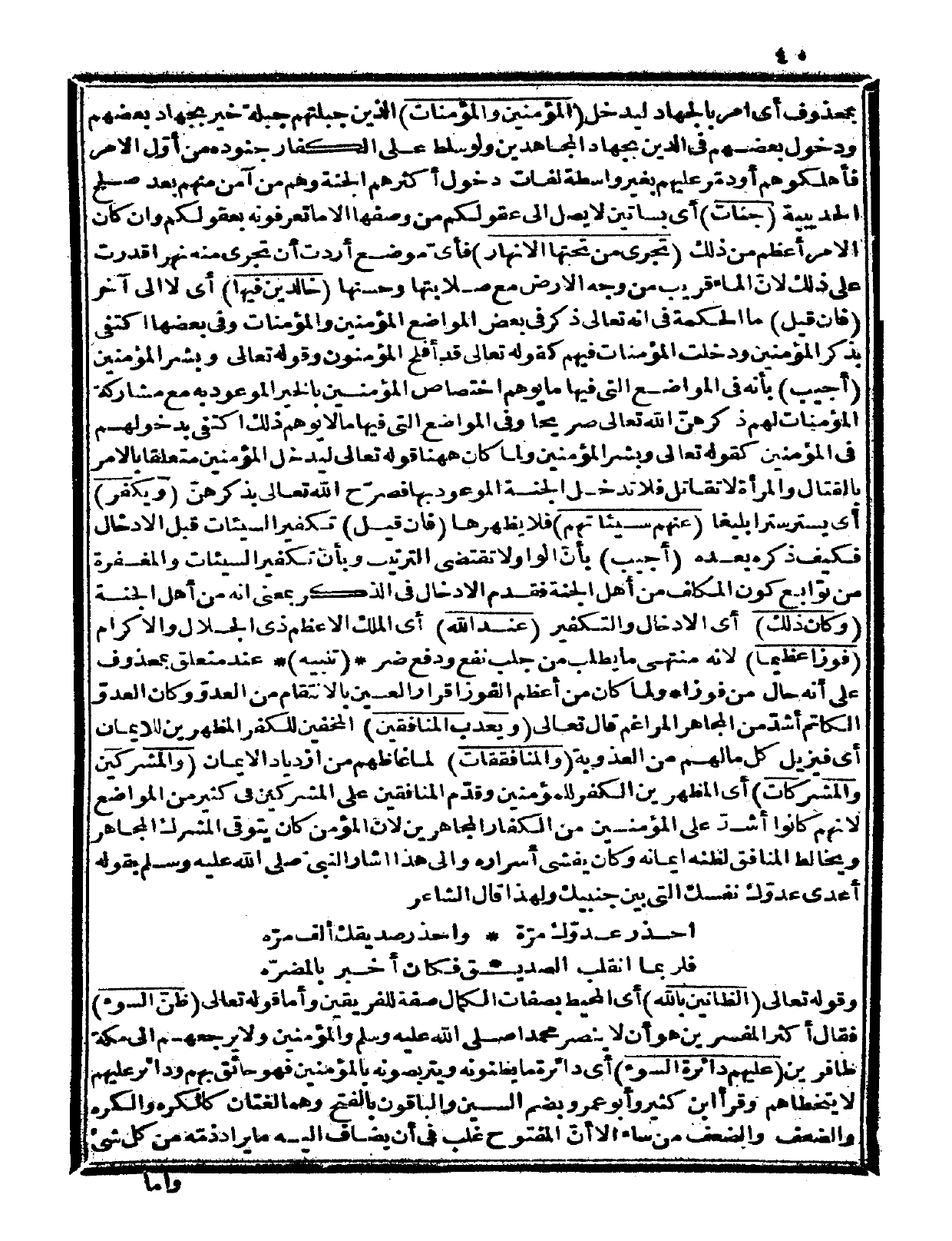 بمحذوف أي: أمر بالجهاد ليدخل {المؤمنين والمؤمنات} الذين جبلتهم جبلة خير بجهاد بعضهم ودخول بعضهم في الدين بجهاد المجاهدين، ولو سلط على الكفار جنوده من أوّل الأمر فأهلكوهم أو دمّر عليهم بغير واسطة لفات دخول أكثرهم الجنة، وهم من آمن منهم بعد صلح الحديبية {جنات} أي بساتين لا يصل إلى عقولكم من وصفها إلا ما تعرفونه بعقولكم وإن كان الأمر أعظم من ذلك {تجري من تحتها الأنهار} فأي موضع أردت أن تجري منه نهراً قدرت على ذلك؛ لأنّ الماء قريب من وجه الأرض مع صلابتها وحسنها {خالدين فيها} أي لا إلى آخر، فإن قيل: ما الحكمة في أنه تعالى ذكر في بعض المواضع المؤمنين والمؤمنات وفي بعضها اكتفى بذكر المؤمنين ودخلت المؤمنات فيهم كقوله تعالى: {قد أفلح المؤمنون} (المؤمنون: 1)