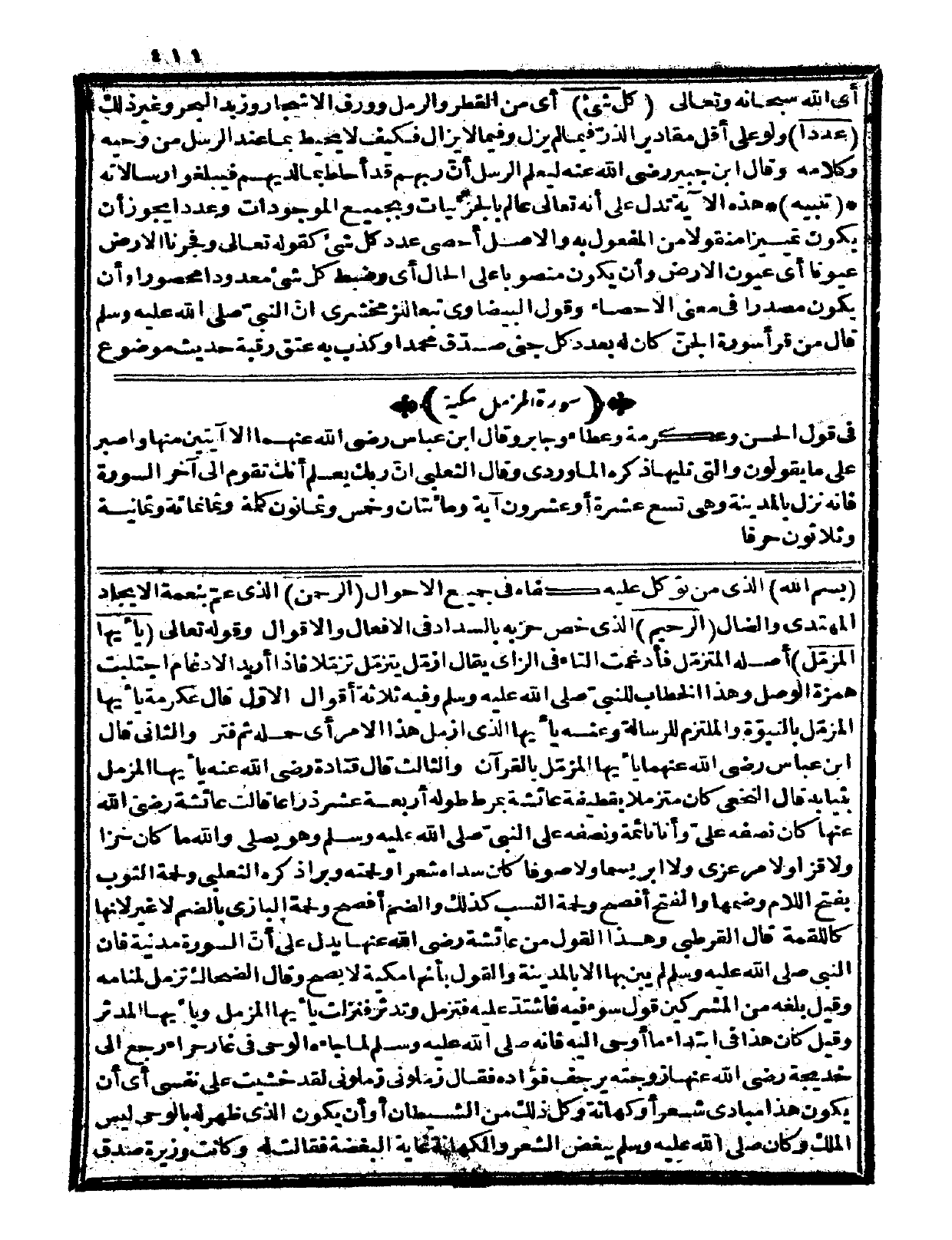{يا أيها المزمّل} أصله: المتزمل فأدغمت التاء في الزاي، يقال: ازمّل يتزمّل تزمّلاً، فإذا أريد الإدغام اجتلبت همزة الوصل، وهذا الخطاب للنبيّ صلى الله عليه وسلم وفيه ثلاثة أقوال: الأول: قال عكرمة: يا أيها المزمّل بالنبوّة والملتزم للرسالة، وعنه: يا أيها الذي ازمل هذا الأمر، أي: حمله ثم فتر. والثاني: قال ابن عباس رضي الله عنهما: يا أيها المزمّل بالقرآن. والثالث: قال قتادة رضي الله عنه: يا أيها المزمّل بثيابه. قال النخعي: كان متزملاً بقطيفة عائشة بمرط طوله أربعة عشر ذراعاً قالت عائشة رضي الله عنها: «كان نصفه عليّ وأنا نائمة ونصفه على النبيّ صلى الله عليه وسلم وهو يصلي والله ما كان خزاً ولا قزاً ولا مرعزى ولا إبريسماً ولا صوفاً كان سداه شعراً ولحمته وبراً» . ذكره الثعلبي، ولحمة الثوب بفتح اللام وضمها والفتح أفصح ولحمة النسب كذلك والضم أفصح ولحمة البازي بالضم لا غير لأنها كاللقمة.