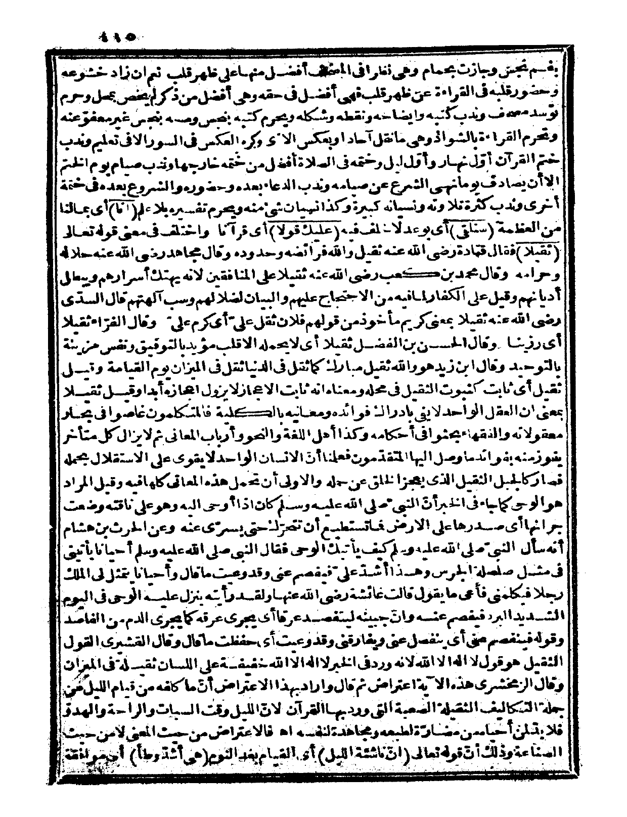 بفم نجس. وجازت بحمام. وهي نظراً في المصحف أفضل منها على ظهر قلب، نعم إن زاد خشوعه وحضور قلبه في القراءة عن ظهر قلب فهي أفضل في حقه. وهي أفضل من ذكر لم يخص بمحل، وحرم توسد مصحف. وندب كتبه وإيضاحه ونقطة وشكله، ويحرم كتبه بنجس ومسه بنجس غير معفوّ عنه، وتحرم القراءة بالشواذ وهي ما نقل آحاداً وبعكس الآي وكره العكس في السور إلا في تعليم.