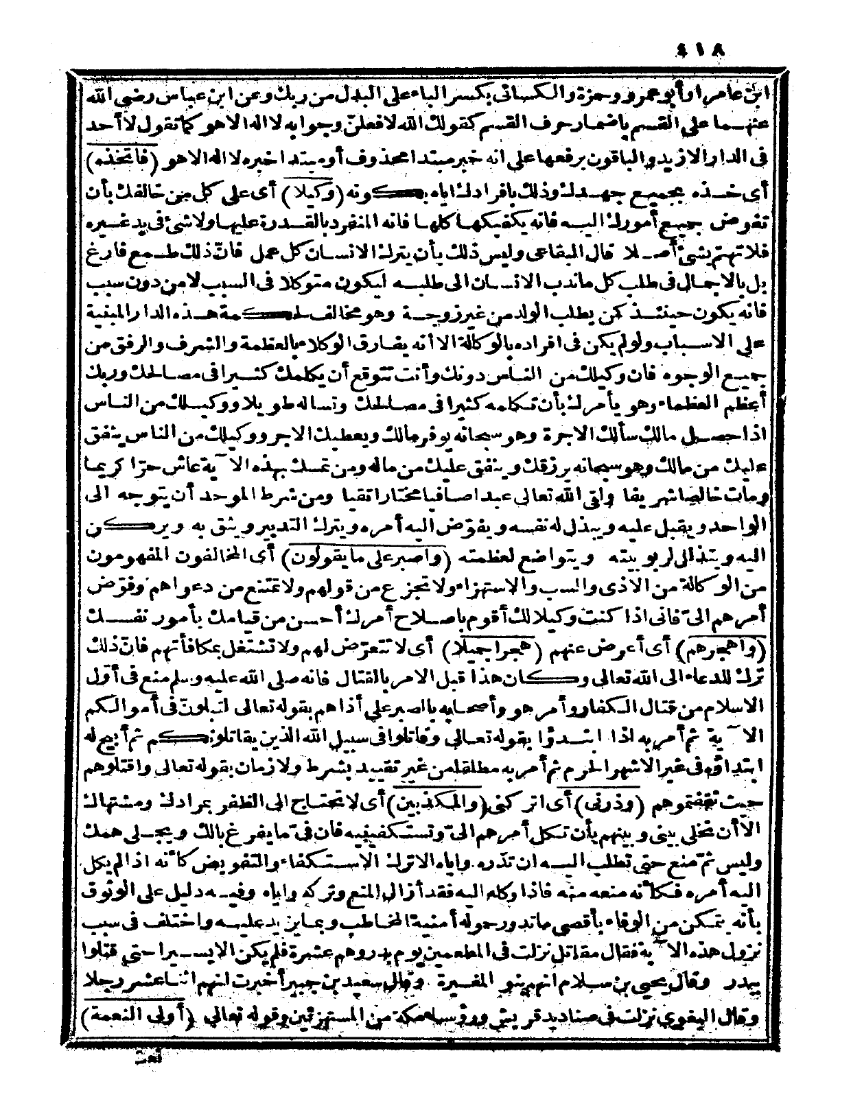 قال البقاعي: وليس ذلك بأن يترك الإنسان كل عمل، فإن ذلك طمع فارغ، بل بالإجمال في طلب كل ما ندب الإنسان إلى طلبه ليكون متوكلاً في السبب لا من دون سبب، فإنه يكون حينئذ كمن يطلب الولد من غير زوجة وهو مخالف لحكمة هذه الدار المبنية على الأسباب، ولو لم يكن في إفراده بالوكالة إلا أنه يفارق الوكلاء بالعظمة والشرف والرفق من جميع الوجوه، فإن وكيلك من الناس دونك وأنت تتوقع أن يكلمك كثيراً في مصالحك وربك أعظم العظماء وهو يأمرك بأن تكلمه كثيراً في مصالحك وتسأله طويلاً، ووكيلك من الناس إذا حصل مالك سألك الأجرة وهو سبحانه يوفر مالك ويعطيك الأجر، ووكيلك من الناس ينفق عليك من مالك وهو سبحانه يرزقك وينفق عليك من ماله.
