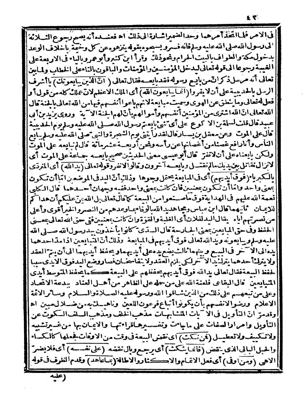 الآية «وروى يزيد بن أبي عبيد قال: قلت لسلمة بن الأكوع على أيّ شيء بايعتم رسول الله صلى الله عليه وسلم يوم الحديبية قال: على الموت» وعن معقل بن يسار قال: «لقد رأيتني يوم الشجرة والنبيّ صلى الله عليه وسلم يبايع الناس وأنا رافع غصناً من أغصانها عن رأسه ونحن أربعة عشر مائة قال: لم نبايعه على الموت ولكن بايعناه على أن لا نفرّ» قال أبو عيسى: معنى الحديثين صحيح بايعه جماعة على الموت. أي لا نزال نقاتل بين يديك ما لم نقتل وبايعه آخرون وقالوا: لا نفر. وقوله تعالى: {يد الله} أي: المتردّي بالكبرياء {فوق أيديهم} أي: في المبايعة يحتمل وجوهاً وذلك أنّ اليد في الموضعين إما أن تكون بمعنى واحد وإمّا أن تكون بمعنيين فإن كانت بمعنى واحد ففيه وجهان: أحدهما قال الكلبي: نعمة الله عليهم في الهداية فوق ما صنعوا من البيعة كما قال تعالى: {بل الله يمنّ عليكم أن هداكم للإيمان} (الحجرات: 17)