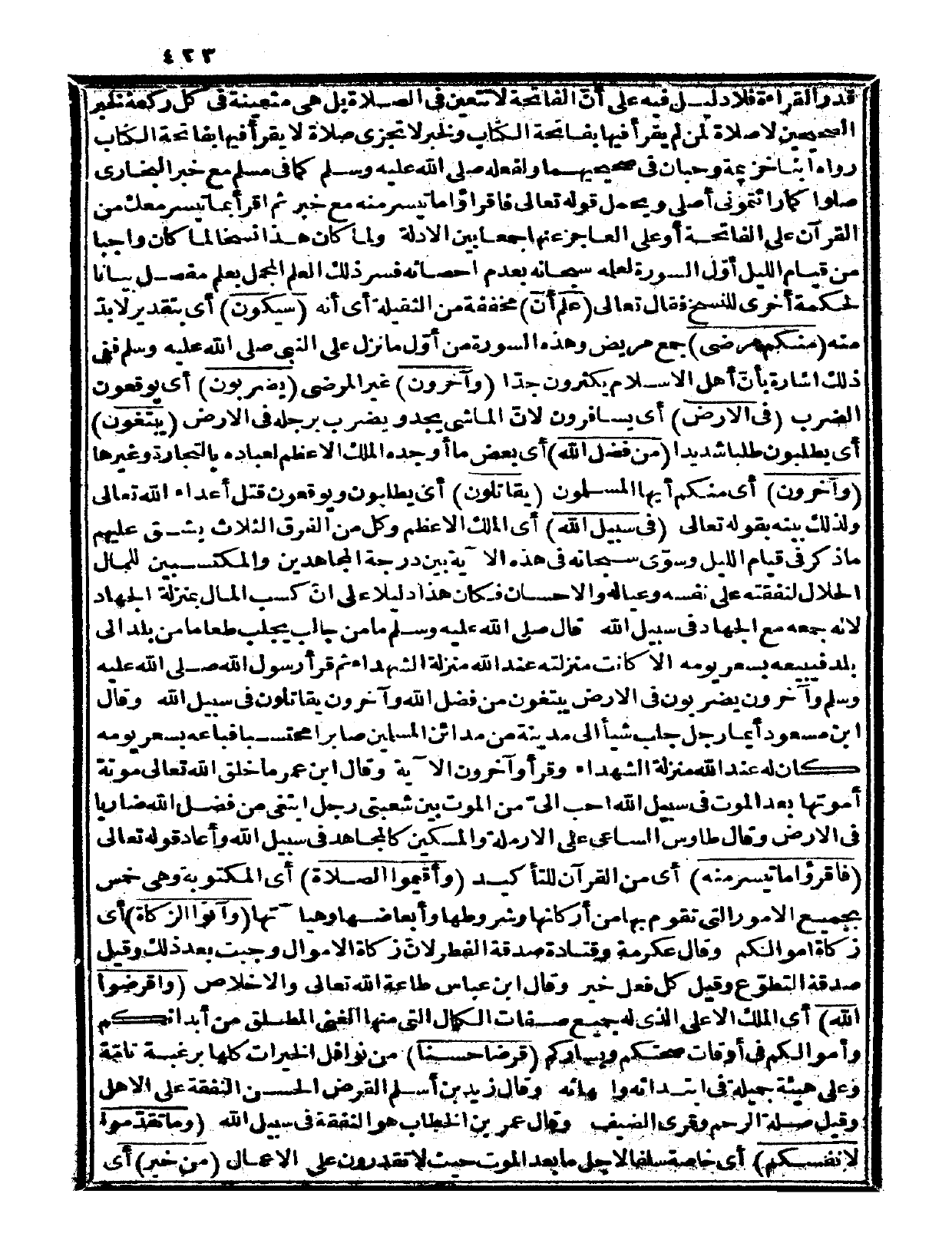 وقال ابن مسعود: أيما رجل جلب شيئاً إلى مدينة من مدائن المسلمين صابراً محتسباً، فباعه بسعر يومه كان له عند الله منزلة الشهداء وقرأ {وآخرون} الآية. وقال ابن عمر: ما خلق الله تعالى موتة أموتها بعد الموت في سبيل الله أحب إليّ من الموت بين شعبتي رجل ابتغى من فضل الله ضارباً في الأرض، وقال طاووس: الساعي على الأرملة والمسكين كالمجاهد في سبيل الله، وأعاد قوله تعالى: {فاقرؤوا ما تيسر منه} أي: من القرآن للتأكيد.
