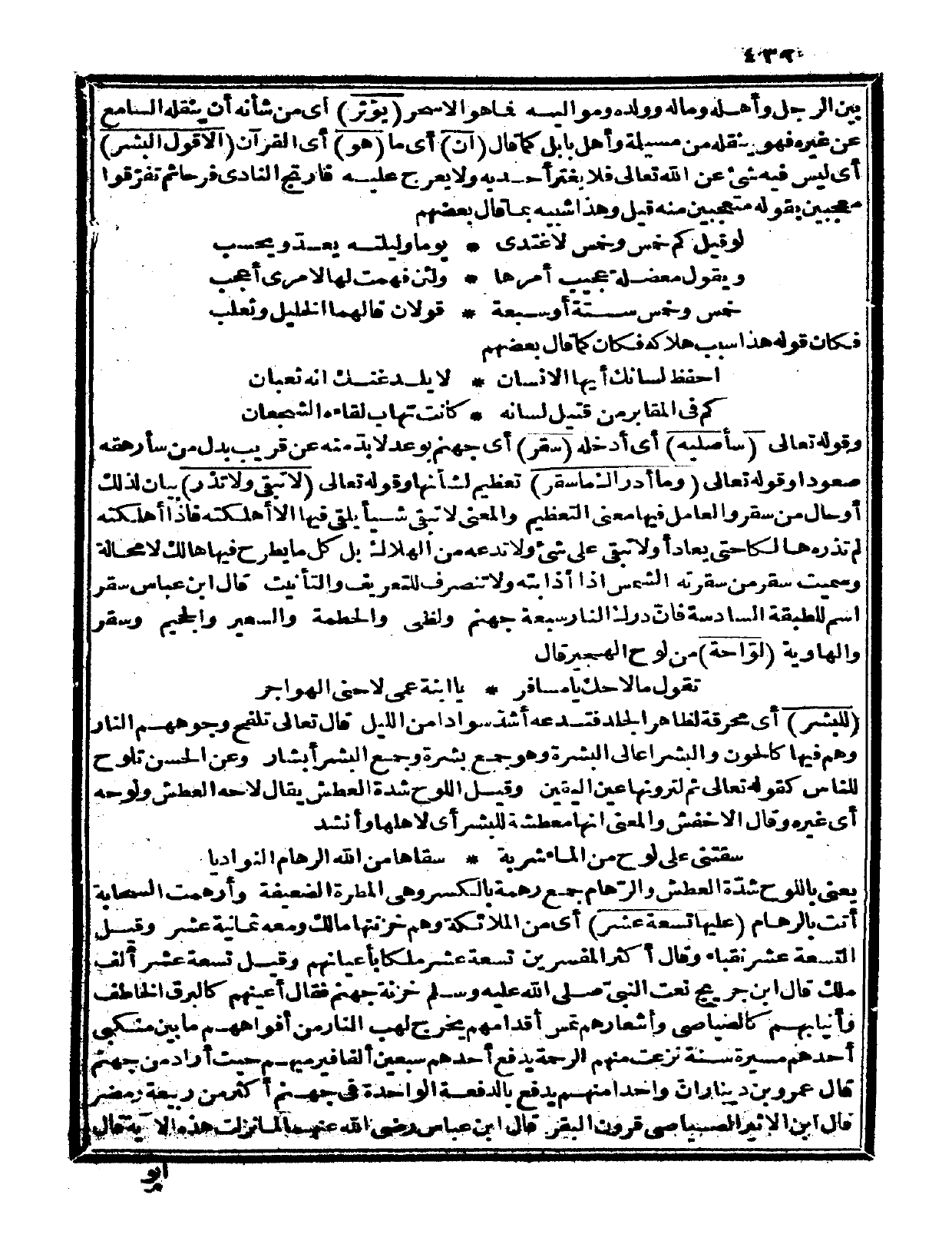 {عليها تسعة عشر} أي: من الملائكة وهم خزنتها مالك ومعه ثمانية عشر، وقيل: التسعة عشر نقباء. وقال أكثر المفسرين: تسعة عشر ملكاً بأعيانهم. وقيل: تسعة عشر ألف ملك. قال ابن جريج: نعت النبيّ صلى الله عليه وسلم خزنة جهنم فقال: «أعينهم كالبرق الخاطف وأنيابهم كالصياصي، وأشعارهم تمس أقدامهم يخرج لهب النار من أفواههم ما بين منكبي أحدهم مسيرة سنة، نزعت منهم الرحمة، يدفع أحدهم سبعين ألفاً فيرميهم حيث أراد من جهنم» . قال عمرو بن دينار: إنّ واحداً منهم يدفع بالدفعة الواحدة في جهنم أكثر من ربيعة ومضر. قال ابن الأثير: الصياصي قرون البقر.