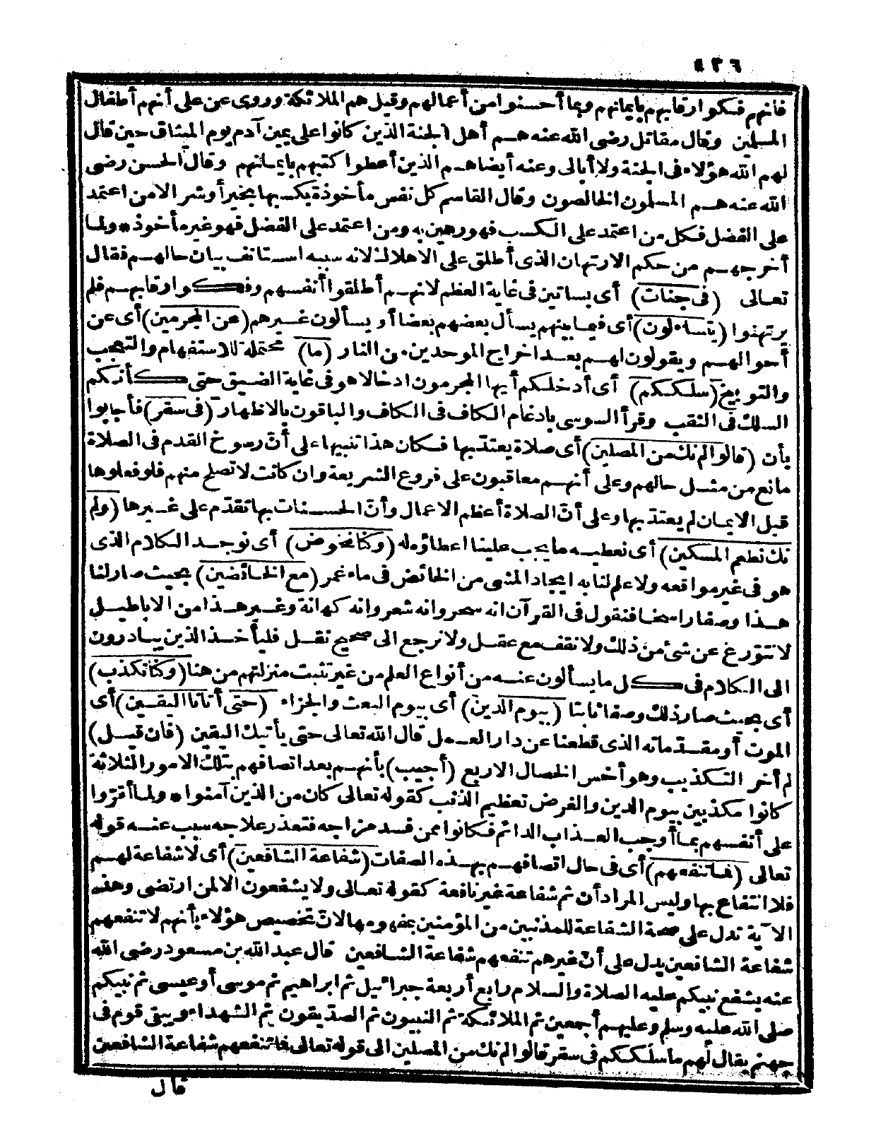 وهذه الآية تدل على صحة الشفاعة للمذنبين من المؤمنين بمفهمومها؛ لأنّ تخصيص هؤلاء بأنهم لا تنفعهم شفاعة الشافعين يدل على أن غيرهم تنفعهم شفاعة الشافعين. قال عبد الله بن مسعود رضي الله عنه: يشفع نبيكم عليه الصلاة والسلام رابع أربعة جبرائيل ثم إبراهيم ثم موسى أو عيسى ثم نبيكم صلى الله عليه وسلم وعليهم أجمعين ثم الملائكة ثم النبيون ثم الصدّيقون ثم الشهداء، ويبقى قوم في جهنم يقال لهم {ما سلككم في سقر قالوا لم نك من المصلين} إلى قوله تعالى: {فما تنفعهم شفاعة الشافعين} .