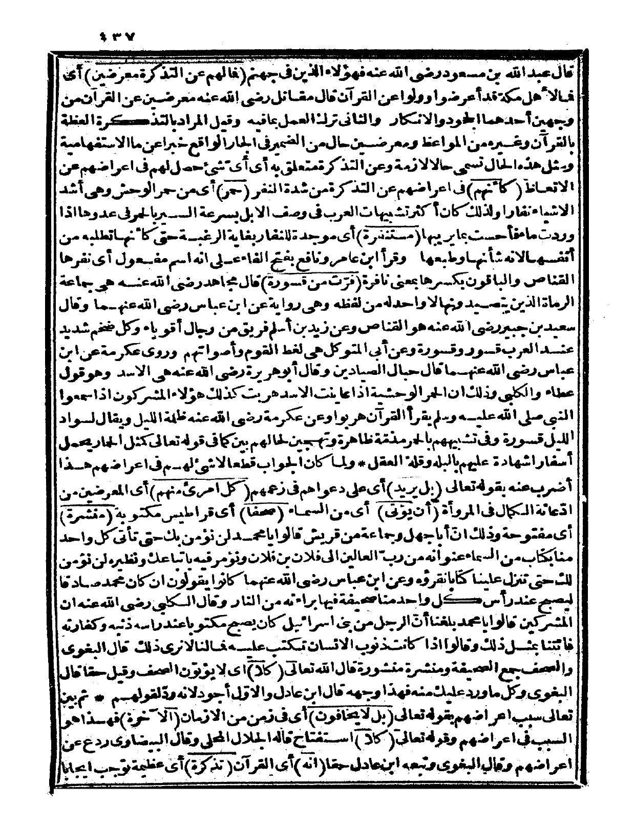 {فرّت من قسورة} قال مجاهد رضي الله عنه: هي جماعة الرماة الذين يتصيدونها لا واحد له من لفظه، وهي رواية عن ابن عباس رضي الله عنهما وقال سعيد بن جبير رضي الله عنه: هو القناص، وعن زيد بن أسلم: فريق من رجال أقوياء. وكل ضخم شديد عند العرب قسور وقسورة، وعن أبي المتوكل هي لغط القوم وأصواتهم. وروى عكرمة عن ابن عباس رضي الله عنهما، قال: حبال الصيادين. وقال أبو هريرة رضي الله عنه: هي الأسد، وهو قول عطاء والكلبي، وذلك أن الحمر الوحشية إذا عاينت الأسد هربت، كذلك هؤلاء المشركون إذا سمعوا النبيّ صلى الله عليه وسلم يقرأ القرآن هربوا، وعن عكرمة رضي الله عنه ظلمة الليل ويقال لسواد الليل قسورة، وفي تشبيههم بالحمر مذمّة ظاهرة وتهجين لحالهم بين كما في قوله تعالى {كمثل الحمار يحمل أسفاراً} (الجمعة: 5)