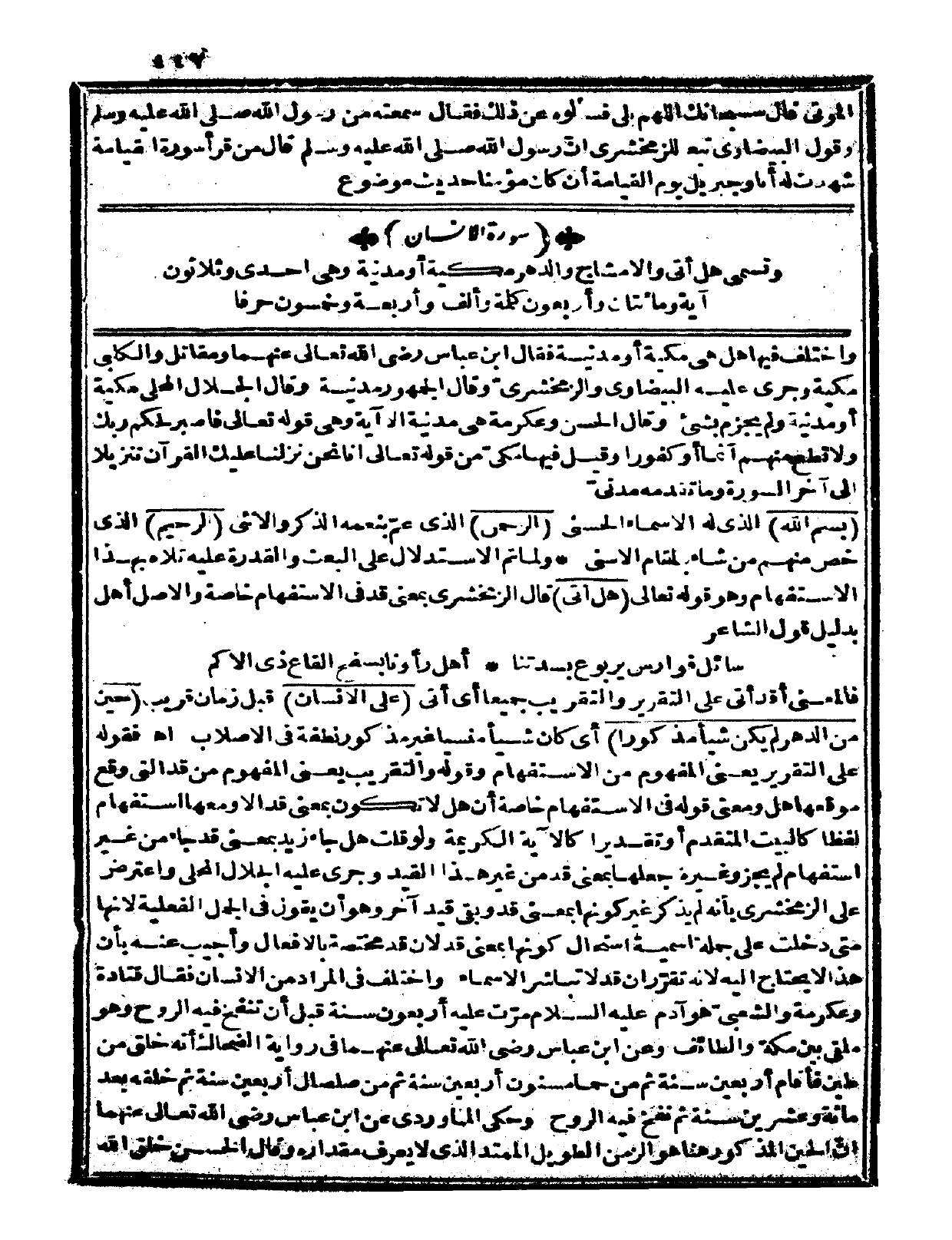 واختلف فيها هل هي مكية أو مدينة فقال ابن عباس رضي الله تعالى عنهما ومقاتل والكلبي: مكية وجرى عليه البيضاوي والزمخشري. وقال الجمهور: مدنية، وقال الجلال المحلي: مكية أومدنية ولم يجزم بشيء. وقال الحسن وعكرمة: هي مدنية إلا آية وهي قوله تعالى: {فاصبر لحكم ربك ولاتطع منهم آثماً أو كفوراً} (الإنسان: 24)
