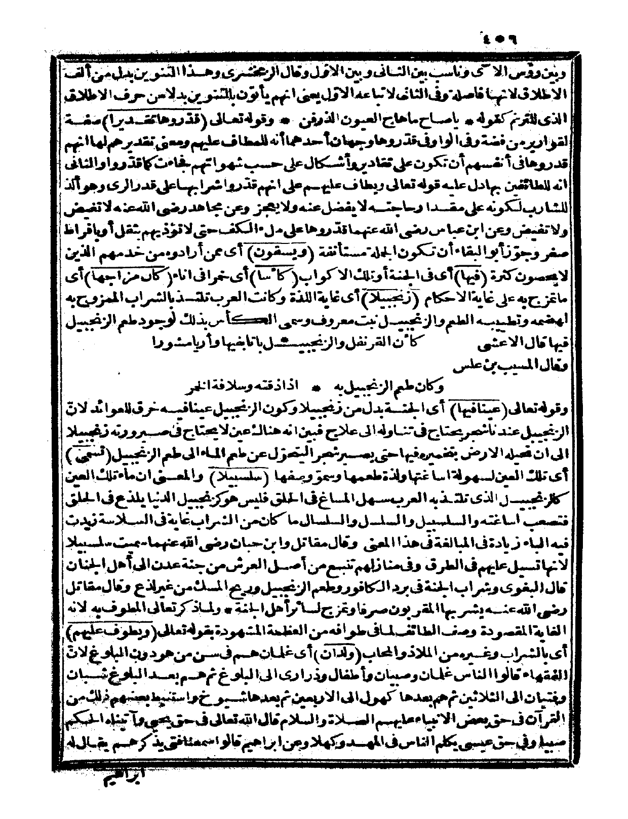وقوله تعالى: {عيناً فيها} أي: الجنة بدل من زنجبيلاً وكون الزنجبيل عيناً فيه خرق للعوائد؛ لأنّ الزنجبيل عندنا شجر يحتاج في تناوله إلى علاج، فبين أنه هناك عين لا يحتاج في صيرورته زنجبيلاً إلى أن تحيله الأرض بتخميره فيها حتى يصير شجراً ليتحوّل عن طعم الماء إلى طعم الزنجبيل {تسمى} أي: تلك العين لسهولة إساغتها ولذة طعمها وسموّ وصفها {سلسبيلاً} والمعنى: أن ماء تلك العين كالزنجبيل الذي تلتذ به العرب سهل المساغ في الحلق، فليس هو كزنجبيل الدنيا يلذع في الحلق فتصعب إساغته. والسلسبيل والسلسل والسلسال ما كان من الشراب غاية في السلاسة زيدت فيه الباء زيادة في المبالغة في هذا المعنى، وقال مقاتل وابن حبان رضي الله عنهما: سميت سلسبيلاً لأنها تسيل عليهم في الطرق وفي منازلهم تنبع من أصل العرش من جنة عدن إلى أهل الجنان. قال البغوي: وشراب الجنة في برد الكافور وطعم الزنجبيل وريح المسك من غير لذع. وقال مقاتل رضي الله عنه: يشربها المقربون صرفاً وتمزج لسائر أهل الجنة.