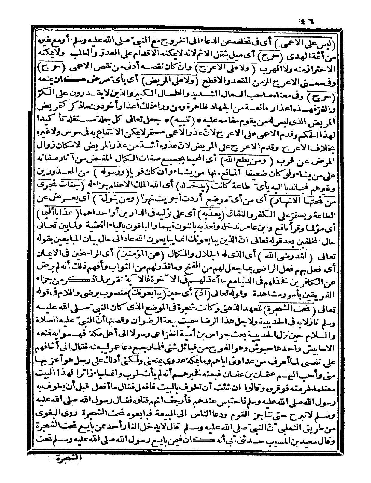 تنبيه: جعل تعالى كل جملة مستقلة تأكيداً لهذا الحكم وقدم الأعمى على الأعرج لأنّ عذر الأعمى مستمر لا يمكن الانتفاع به في حرس ولا غيره بخلاف الأعرج وقدم الأعرج على المريض لأنّ عذره أشد من عذر المريض لإمكان زوال المرض عن قرب.
