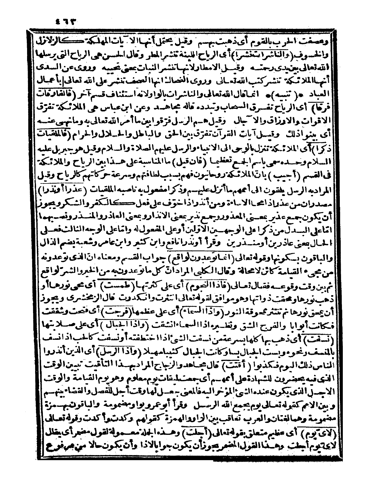{فالفارقات فرقاً} أي: الرياح تفرق السحاب وتبدده قاله مجاهد، وعن ابن عباس هي الملائكة تفرّق الأقوات والأرزاق والآجال، وقيل: هم الرسل فرّقوا بين ما أمر الله تعالى به وما نهى عنه أي: بينوا ذلك، وقيل: آيات القرآن تفرّق بين الحق والباطل والحلال والحرام.