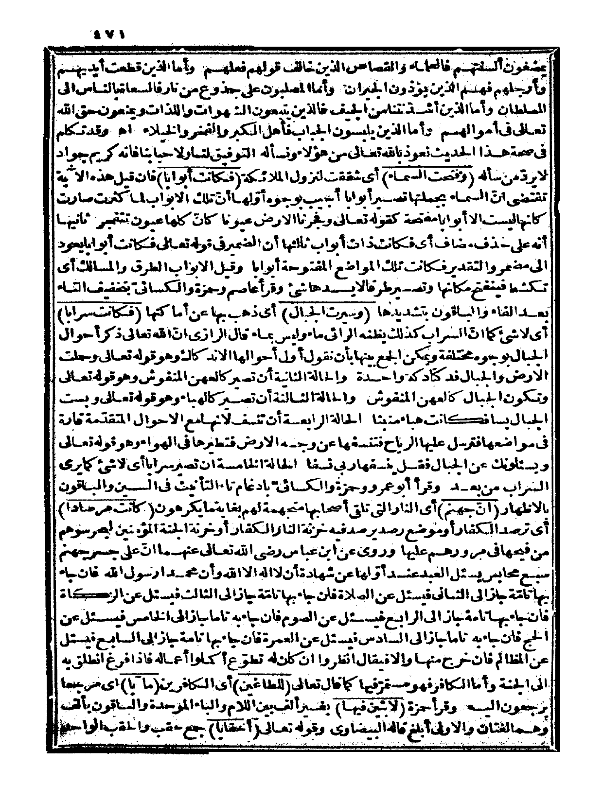 كأنّ كلها عيون تتفجر. ثانيها: أنه على حذف مضاف، أي: فكانت ذات أبواب. ثالثها: أن الضمير في قوله تعالى: {فكانت أبواباً} يعود إلى مضمر، والتقدير فكانت تلك المواضع المفتوحة أبواباً، وقيل: الأبواب الطرق والمسالك أي: تكشط فينفتح مكانها وتصير طرقاً لا يسدها شيء، وقرأ عاصم وحمزة والكسائي بتخفيف التاء بعد الفاء والباقون بتشديدها.