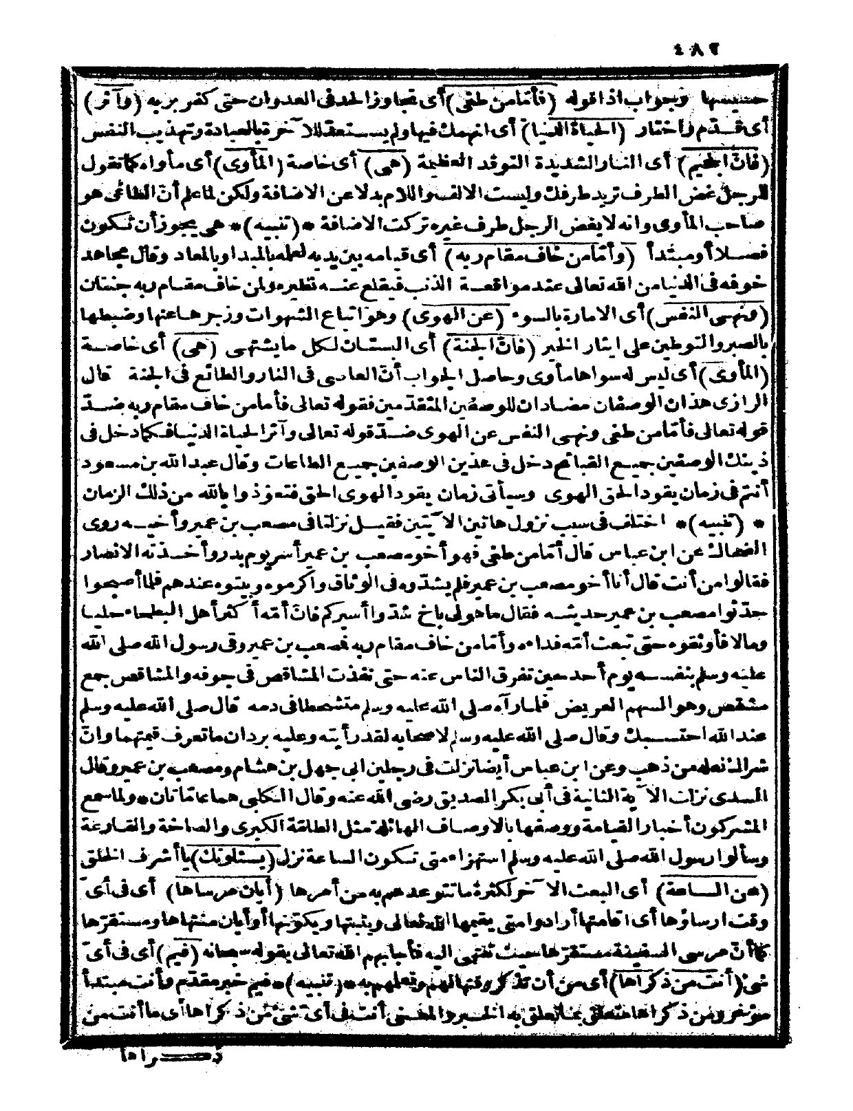 تنبيه: اختلف في سبب نزول هاتين الآيتين، فقيل: نزلتا في مصعب بن عمير وأخيه. روى الضحاك عن ابن عباس قال: {أمّا من طغى} فهو أخو مصعب بن عمير أسر يوم بدر وأخذته الأنصار فقالوا: من أنت، قال: أنا أخو مصعب بن عمير فلم يشدّوه في الوثاق وأكرموه وبيتوه عندهم فلما أصبحوا حدّثوا مصعب بن عمير حديثه، فقال: ما هو لي بأخ شدّوا أسيركم، فإنّ أمّه أكثر أهل البطحاء حلياً ومالاً، فأوثقوه حتى تبعث أمّه فداءه، {وأمّا من خاف مقام ربه} فمصعب بن عمير وقى رسول الله صلى الله عليه وسلم بنفسه يوم أحد حين تفرق الناس عنه حتى نفذت المشاقص في جوفه، والمشاقص جمع مشقص وهو السهم العريض، فلما رآه صلى الله عليه وسلم متشحطاً في دمه قال صلى الله عليه وسلم «عند الله أحتسبك» وقال صلى الله عليه وسلم لأصحابه: «لقد رأيته وعليه بردان ما تعرف قيمتهما وإنّ شراك نعله من ذهب» وعن ابن عباس أيضاً: نزلت في رجلين أبي جهل بن هشام ومصعب بن عمير. وقال السدي: نزلت الآية الثانية في أبي بكر الصديق رضي الله عنه. وقال الكلبي: هما عامّتان.