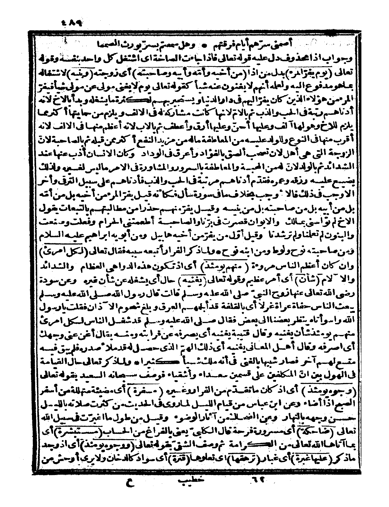 فيفرّ المرء من هؤلاء الذين كان يفرّ إليهم في دار الدنيا ويستجير بهم لكثرة ما يشغله. وبدأ بالأخ لأنه أدناهم رتبة في الحب والذب، ثم بالأمّ لأنها كانت مشاركة له في الإلف ويلزم من حمايتها أكثر مما يلزم للأخ، وهو لها آلف وعليها أحنّ وعليها أرق وأعطف، ثم بالأب لأنه أعظم منها في الإلف لأنه أقرب منها في النوع، وللولد عليه من المعاطفة ما له من مزيد النفع أكثر ممن قبله، ثم بالصاحبة لأنّ الزوجة التي هي أهل لأن تصحب ألصق بالفؤاد وأعرق في الوداد، وكان الإنسان أذب عنها عند الشدائد، ثم بالولد لأنّ له من المحبة والمعاطفة بالسرور والمشاورة في الأمر ما ليس لغيره، ولذلك يضيع عليه رزقه وعمره.