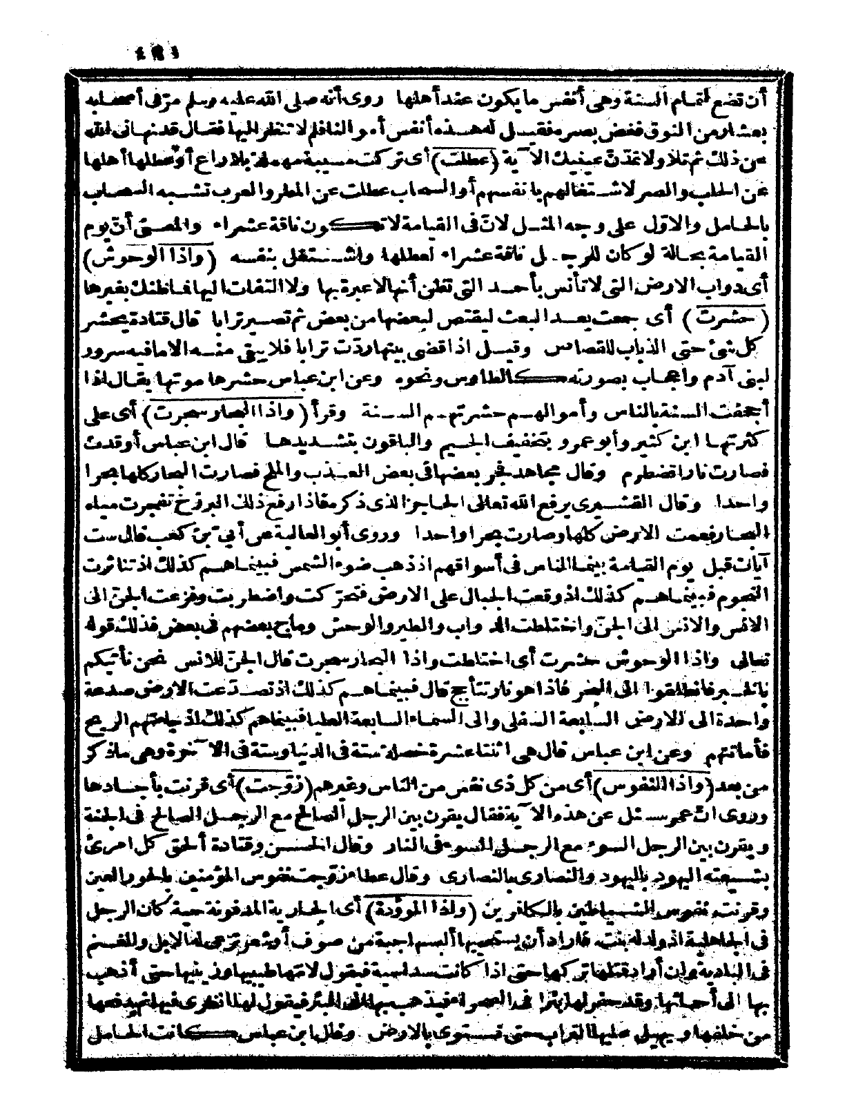 {وإذا الوحوش} أي: دواب الأرض التي لا تأنس بأحد التي تظن أنها لا عبرة بها ولا التفات إليها فما ظنك بغيرها {حشرت} أي: جمعت بعد البعث ليقتص لبعضها من بعض ثم تصير تراباً. قال قتادة: يحشر كل شيء حتى الذباب للقصاص. وقيل: إذا قضي بينها ردّت تراباً فلا يبقى منه إلا ما فيه سرور لبني آدم وإعجاب بصورته كالطاووس ونحوه. وعن ابن عباس حشرها موتها، يقال إذا أجحفت السنة بالناس وأموالهم: حشرتهم السنة.