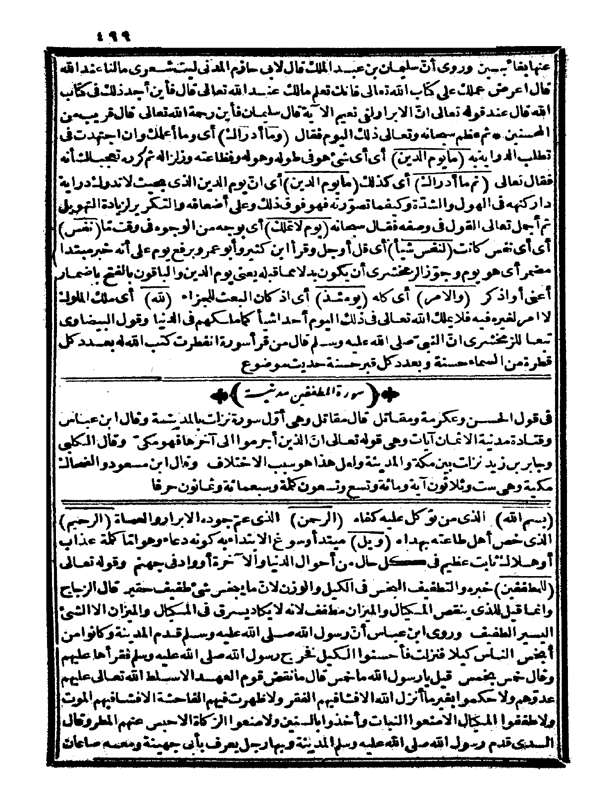 وروى ابن عباس أنّ رسول الله صلى الله عليه وسلم قدم المدينة، وكانوا من أبخس الناس كيلاً فنزلت فأحسنوا الكيل، فخرج رسول الله صلى الله عليه وسلم فقرأها عليهم وقال: «خمس بخمس» قيل: يا رسول الله ما خمس؟ قال: «ما نقض قوم العهد إلا سلط الله تعالى عليهم عدوّهم، ولا حكموا بغير ما أنزل الله إلا فشا فيهم الفقر، ولا ظهرت فيهم الفاحشة إلا فشا فيهم الموت، ولا طففوا المكيال إلا منعوا النبات وأخذوا بالسنين، ولا منعوا الزكاة إلا حبس عنهم المطر» . وقال: السدي: قدم رسول الله صلى الله عليه وسلم المدينة وبها رجل يعرف بأبي جهينة، ومعه صاعان