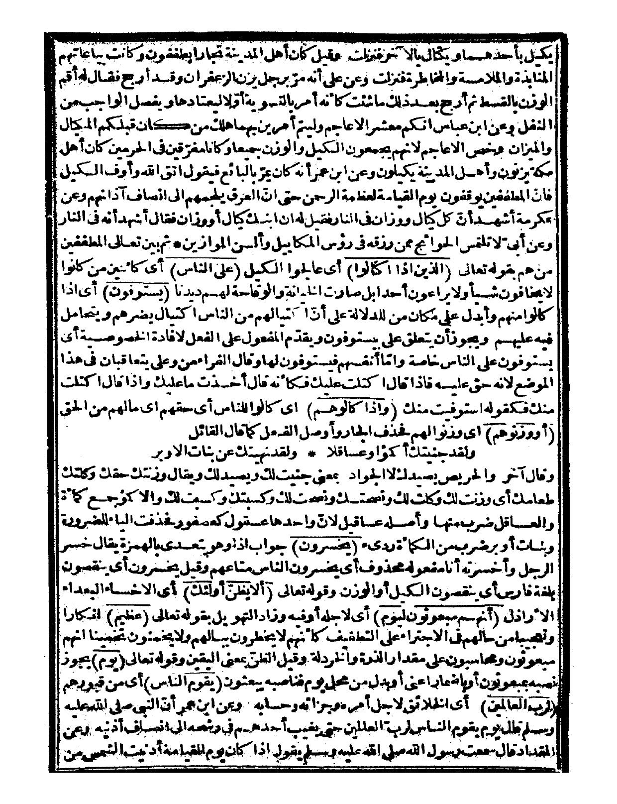 وقيل: كان أهل المدينة تجاراً يطففون، وكانت بياعاتهم المنابذة والملامسة والمخاطرة فنزلت. وعن عليّ أنه مرّ برجل يزن الزعفران وقد أرجح فقال له: أقم الوزن بالقسط، ثم أرجح بعد ذلك ما شئت كأنه أمر بالتسوية أوّلاً ليعتادها ويفصل الواجب من النفل. وعن ابن عباس: إنكم معشر الأعاجم وليتم أمرين بهما هلك من كان قبلكم المكيال والميزان، وخص الأعاجم لأنهم يجمعون الكيل والوزن جميعاً وكانا مفرّقين في الحرمين، كان أهل مكة يزنون وأهل المدينة يكيلون. وعن ابن عمر أنه كان يمرّ بالبائع فيقول: اتق الله وأوف الكيل، فإن المطففين يوقفون يوم القيامة لعظمة الرحمن حتى إنّ العرق يلجمهم إلى أنصاف آذانهم. وعن عكرمة أشهد أنّ كل كيال ووزان في النار فقيل له: إن ابنك كيال أو وزان فقال: أشهد أنه في النار. وعن أبيّ: لا تلتمس الحوائج ممن رزقه في رؤوس المكاييل وألسن الموازين.