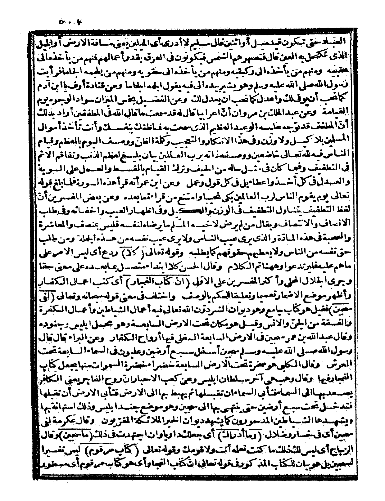 العباد. حتى تكون قيد ميل أو اثنين ـ قال سليم: لا أدري أي: الميلين يعني: مسافة الأرض أو الميل الذي تكتحل به العين ـ قال: فتصهرهم الشمس فيكونون في العرق بقدر أعمالهم فمنهم من يأخذه إلى عقبيه، ومنهم من يأخذه إلى ركبتيه، ومنهم من يأخذه على حقويه، ومنهم من يلجمه إلجاماً، فرأيت رسول الله صلى الله عليه وسلم وهو يشير بيده إلى فيه يقول: ألجمه إلجاماً» . وعن قتادة: أوف يا ابن آدم كما تحب أن يوفى لك، واعدل كما تحب أن يعدل لك. وعن الفضيل: بخس الميزان سواد الوجوه يوم القيامة. وعن عبد الملك بن مروان أنّ أعرابياً قال له: سمعت ما قال الله في المطففين أراد بذلك أنّ المطفف قد توجه عليه الوعيد العظيم، الذي سمعت به فما ظنك بنفسك وأنت تأخذ أموال المسلمين بلا كيل ولا وزن، وفي هذا الإنكار والتعجيب وكلمة الظنّ ووصف اليوم بالعظم وقيام الناس فيه لله تعالى خاضعين، ووصفه ذاته برب العالمين بيان بليغ لعظم الذنب، وتفاقم الإثم في التطفيف وفيما كان في مثل حاله من الحيف، وترك القيام بالقسط والعمل على السوية، والعدل في كل أخذ وإعطاء بل في كل قول وعمل.