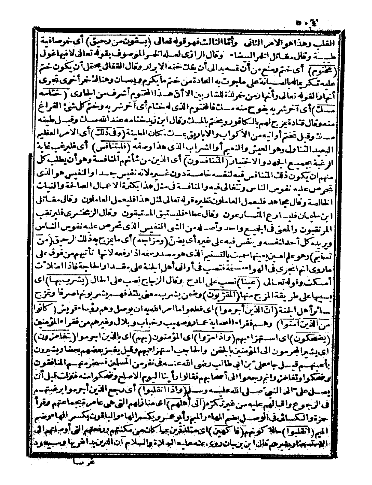 {ختامه مسك} أي: آخر شربه يفوح منه مسك، فالمختوم الذي له ختام، أي: آخر شربه، وختم كل شيء الفراغ منه. وقال قتادة: يمزج لهم بالكافور ويختم بالمسك. وقال ابن زيد: ختامه عند الله مسك. وقيل: طينه مسك. وقيل: تختم أوانيه من الأكواب والأباريق بمسك مكان الطينة.