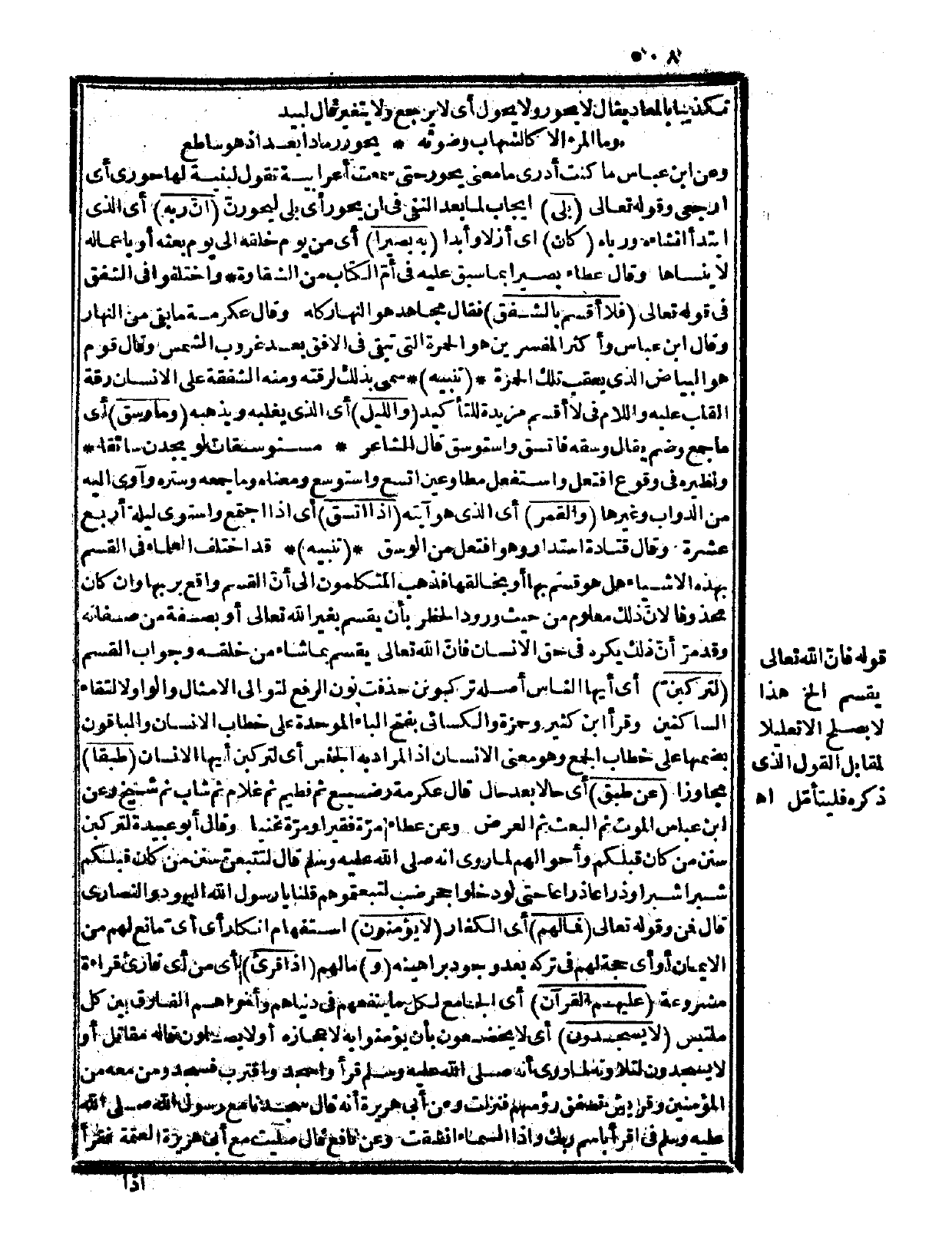 تنبيه: قد اختلف العلماء في القسم بهذه الأشياء هل هو قسم بها أو بخالقها؟ فذهب المتكلمون. إلى أنّ القسم واقع بربها وإن كان محذوفاً؛ لأنّ ذلك معلوم من حيث ورود الحظر بأن يقسم بغير الله تعالى أو بصفة من صفاته، وقد مرّ أنّ ذلك يكره في حق الإنسان، فإنّ الله تعالى يقسم بما شاء من خلقه وجواب القسم. { {