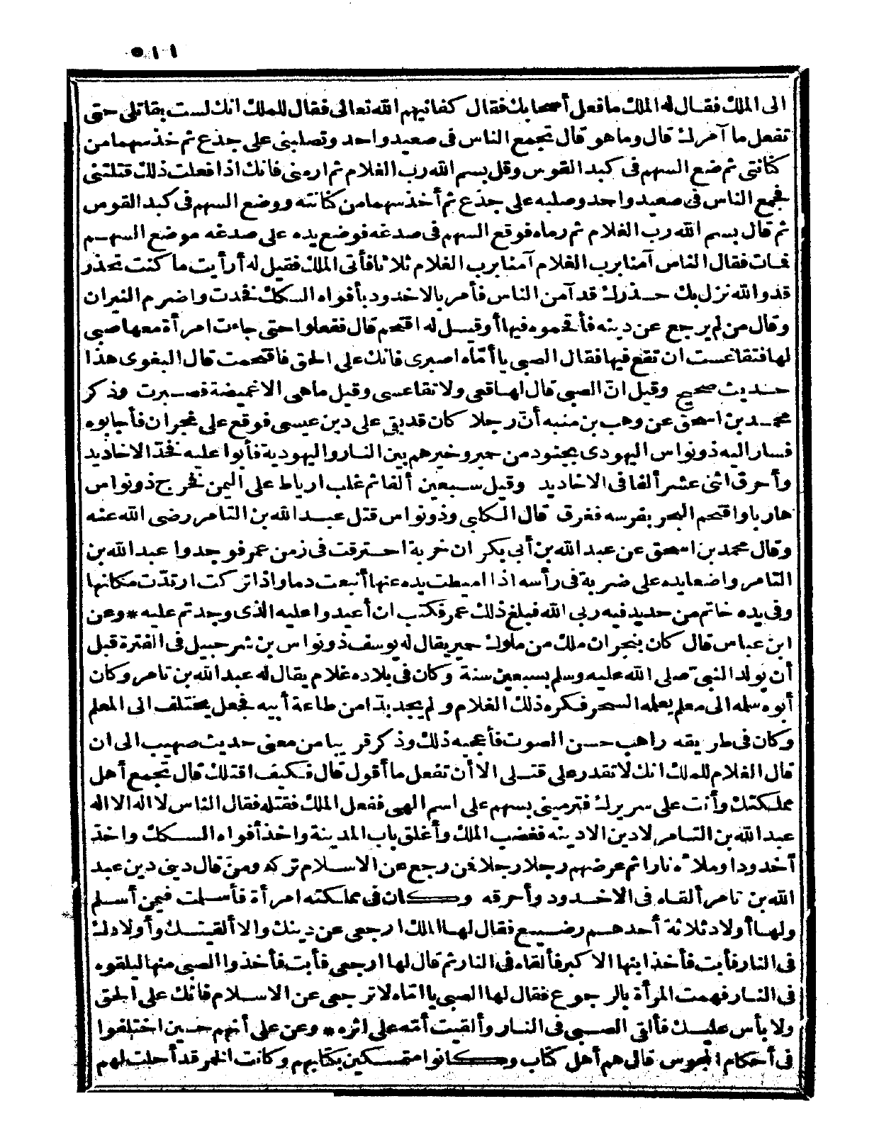 وعن ابن عباس قال: كان بنجران ملك من ملوك حمير يقال له يوسف ذو نواس بن شرحبيل في الفترة قبل أن يولد النبيّ صلى الله عليه وسلم بسبعين سنة، وكان في بلاده غلام يقال له عبد الله بن تامر، وكان أبوه سلمه إلى معلم يعلمه السحر فكره ذلك الغلام، ولم يجد بدّاً من طاعة أبيه فجعل يختلف إلى المعلم، وكان في طريقه راهب حسن الصوت فأعجبه ذلك، وذكر قريباً من معنى حديث صهيب إلى أن قال الغلام للملك: إنك لا تقدر على قتلي إلا أن تفعل ما أقول. قال: فكيف أقتلك؟ قال: تجمع أهل مملكتك وأنت على سريرك فترميني بسهم على اسم إلهي، ففعل الملك فقتله فقال الناس: لا إله إلا إله، عبد الله بن التامر لا دين إلا دينه، فغضب الملك وأغلق باب المدينة، وأخذ أفواه السكك وأخدّ أخدوداً وملأه ناراً ثم عرضهم رجلاً رجلاً، فمن رجع عن الإسلام تركه، ومن قال: ديني دين عبد الله بن تامر ألقاه في الأخدود وأحرقه، وكان في مملكته امرأة فأسلمت فيمن أسلم ولها أولاد ثلاثة: أحدهم رضيع فقال لها الملك: ارجعي عن دينك وإلا ألقيتك وأولادك في النار فأبت، فأخذ ابنها الأكبر فألقاه في النار، ثم قال لها: ارجعي فأبت فأخذوا الصبي منها ليلقوه في النار فهمت المرأة بالرجوع فقال لها الصبي: يا أمّاه لا ترجعي عن الإسلام فإنك على الحق ولا بأس عليك فألقى الصبي في النار، وألقيت أمّه على أثره.
