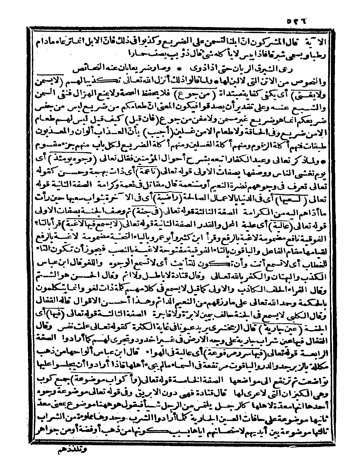 {لا يسمع فيها لاغية} قرأ بالتاء الفوقية نافع مضمومة لاغية بالرفع، وقرأ ابن كثير وأبو عمرو بالياء التحتية مضمومة لاغية بالرفع لقيامها مقام الفاعل، والباقون بالتاء الفوقية مفتوحة لاغية بالنصب فيجوز أن تكون التاء للخطاب، أي: لا تسمع أنت وأن تكون للتأنيث، أي: لا تسمع الوجوه واللغو. وقال ابن عباس: الكذب والبهتان والكفر بالله تعالى. وقال قتادة: لا با طل ولا إثم. وقال الحسن: هو الشتم. وقال الفراء: الحلف الكاذب، والأولى كما قيل: لا يسمع في كلامهم كلمة ذات لغو، وإنما يتكلمون بالحكمة وحمد الله تعالى على ما رزقهم من النعيم الدائم وهذا أحسن الأقوال قاله القفال. وقال الكلبي: لا يسمع في الجنة حالف بيمين لا برّة ولا فاجرة.
