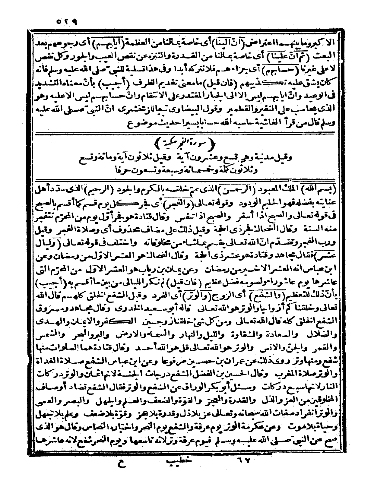 وقيل: مدنية وهي تسع وعشرون آية وقيل: ثلاثون آية ومائةوتسع وثلاثون كلمة وخمسمائة وسبعة وتسعون حرفاً
